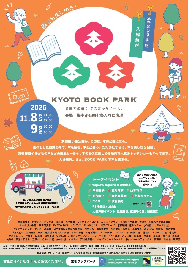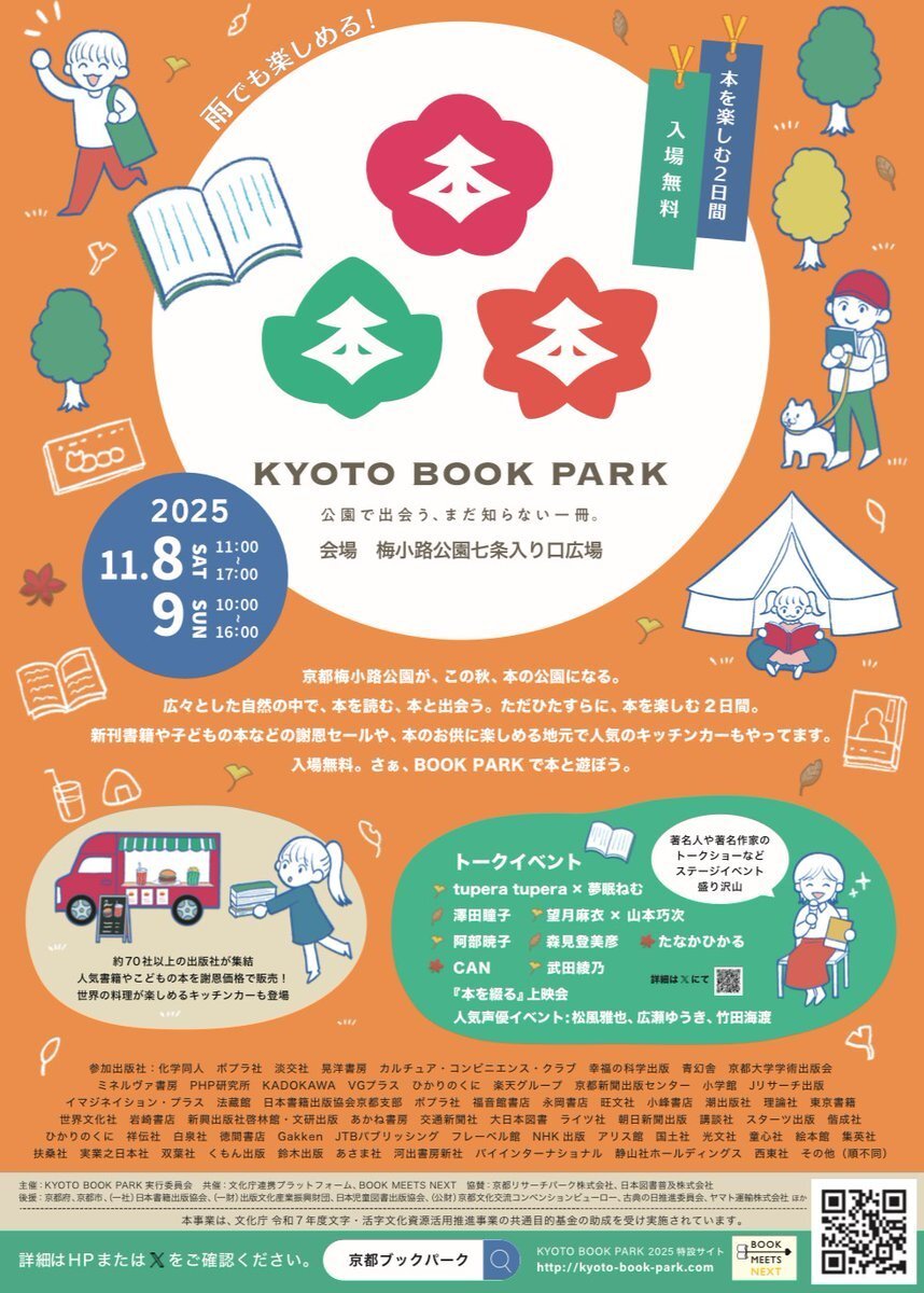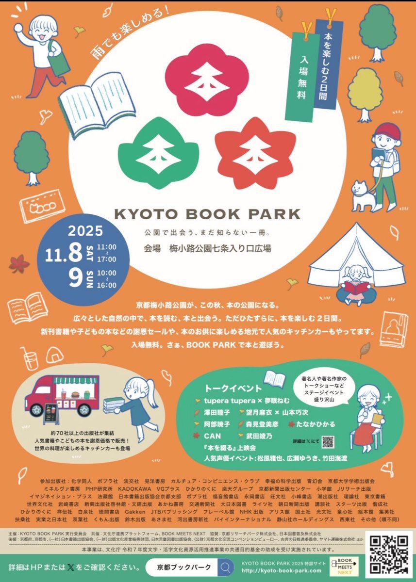 \\\📣梅小路で待ち合わせ📣/// #京都ブックパーク に 11/8〜11/9 出店します!ブックパーク限定特典もご用意していますので、この機会に紅葉狩りと本の宝探しをお楽しみください🍁📚 #梅小路公園 七条入り口広場でお待ちしています😇 詳細は➡️ kyoto-bookpark.jp 公式X➡️ @kyotobookpark pic.x.com/WqgmBm9NGG