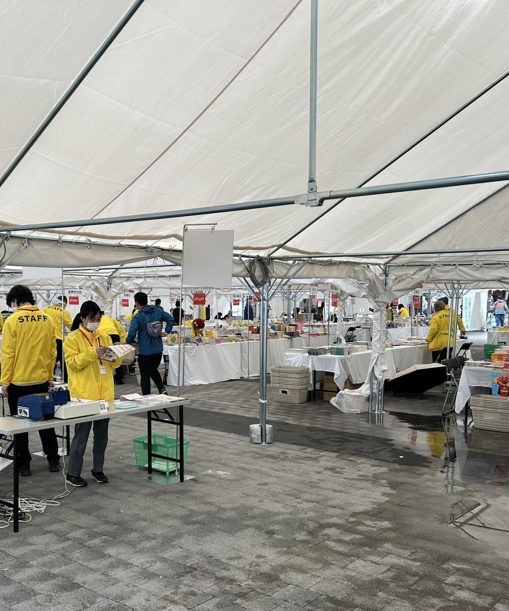 KYOTO BOOK PARK 2日目。あいにくのお天気もひろ〜いテントの中はお構いなし。雨だれの音を聞きながら、ゆっくり本を探していただけます。10:00-16:00ご来場お待ちしています。 #kyotobookpark #梅小路公園 pic.x.com/gquqGCMLDC