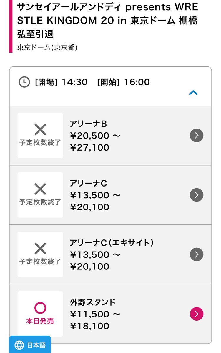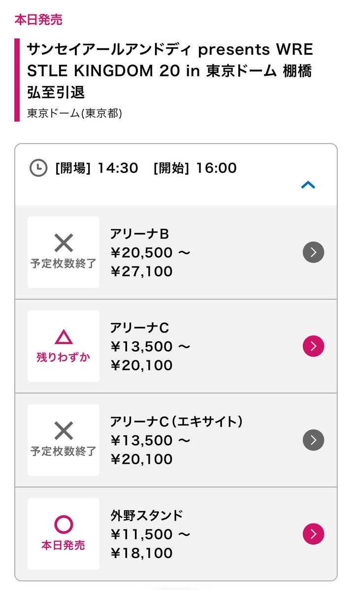 凄い!?光の速さで予定数終了 急げ💨 1/4東京ドームチケット増席追加 🎫アリーナB:予定数終了 🎫アリーナC:予定数終了 🎫アリーナC(エキサイトシート):予定数終了 🎫外野スタンド:販売中 #njwk20 #棚橋引退 #njpw x.com/njpw_nyao/stat…
