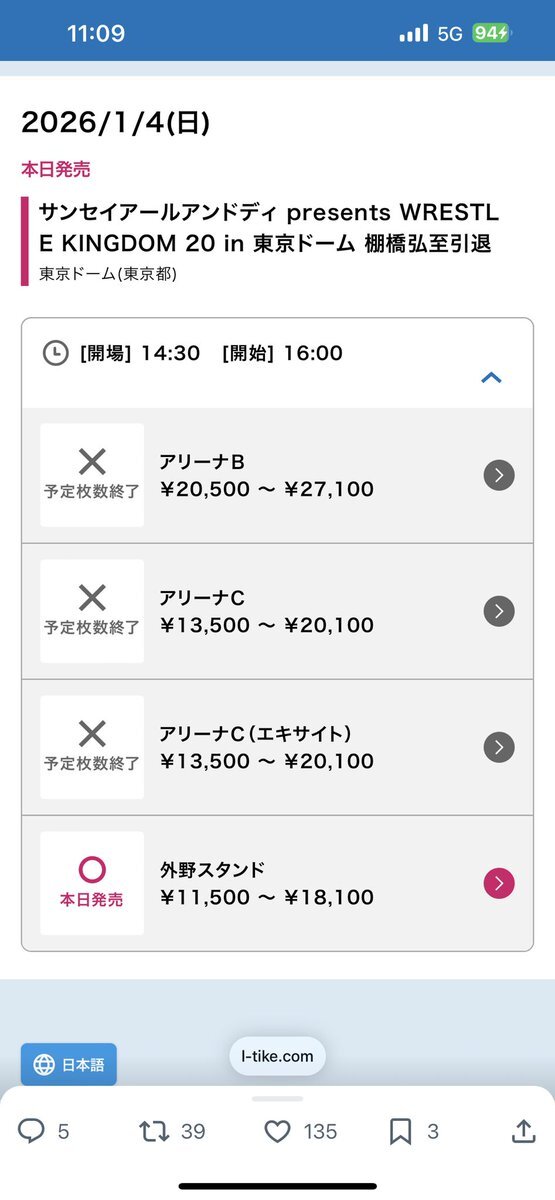 【1.4東京ドームの“増席追加販売”がスタート!!】 ・アリーナB:予定数終了 ・アリーナC:予定数終了 ・アリーナC(エキサイトシート):予定数終了 ・外野スタンド:販売中 ⇒l-tike.com/order/?gLcode=… ※予定数終了の席種も、予約流れが発生した場合は再販売いたします #njwk20 #棚橋引退 x.com/njpw1972/statu…