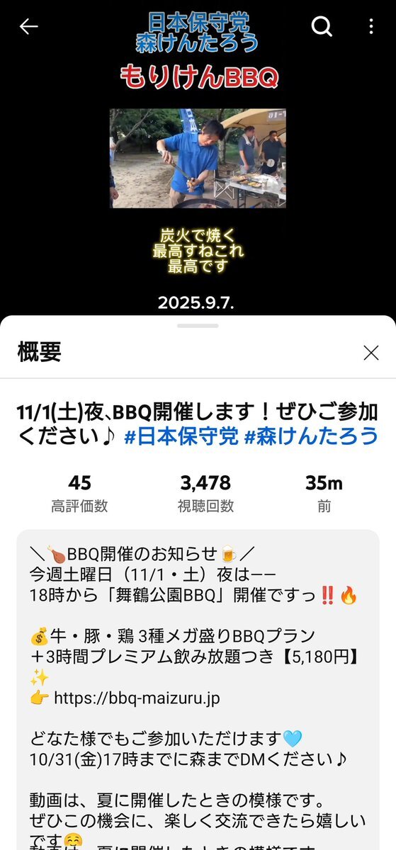 もりけんチャンネルのショート 動画でBBQ開催の告知❗️ 11/1 土曜日 18時から舞鶴公園にてBBQを開催予定❗️ 参加されたい方は概要欄を確認の うえ連絡して下さいませ❗️🙇✨ @moriken0119 #日本保守党 #日本保守党福岡支部長 #森けんたろうを国政へ #日本を豊かに強く youtube.com/shorts/mabR3MX… pic.x.com/0QCAcoWihV