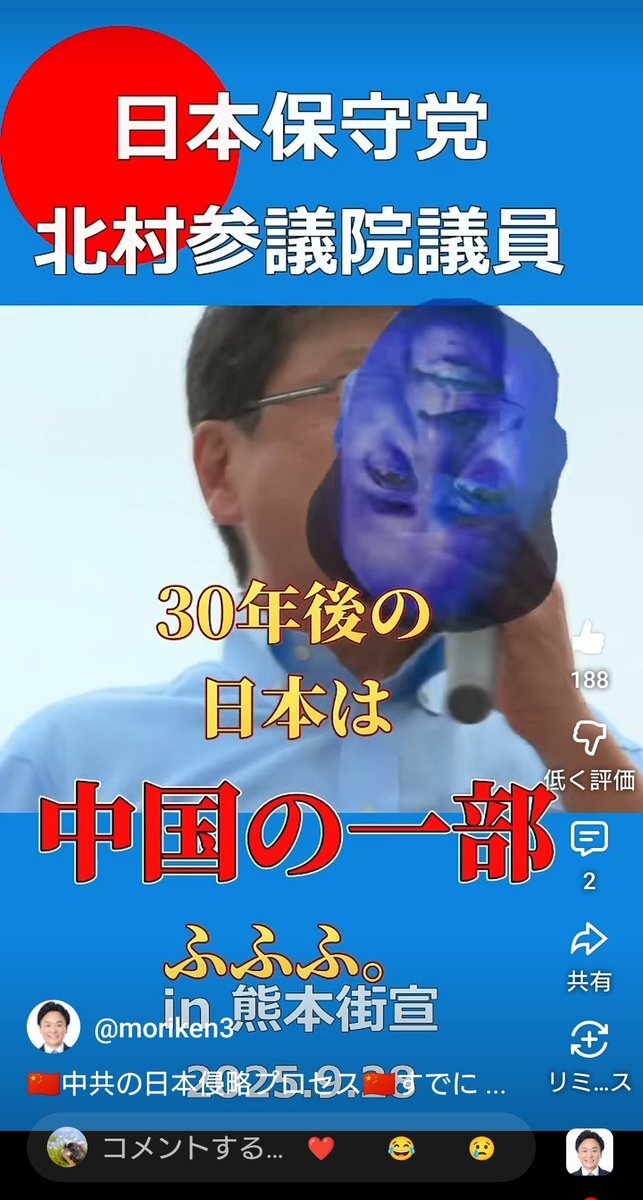 北村先生の演説に中国に対する 危機感を感じます。 多くの方に見て欲しいです❗️ 🙇✨ #日本保守党 #北村晴男参議院議員 #森けんたろう #福岡支部長 #森けんたろうを国政へ x.com/moriken0119/st…