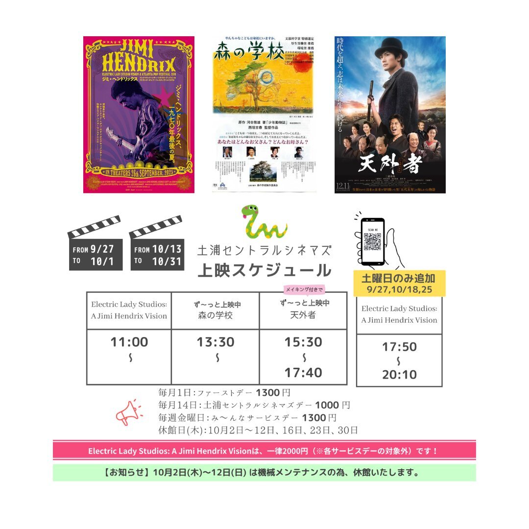 😎上映スケジュール 🎬9/27〜10/31 #JimiHendrix #ElectricLadyStudios:AJimiHendrixVision ⚠️10/2(木)〜10/12(日)は休館日💤⚠️ 🎬11/8〜11/28 #WHO? #なるせゆうせい監督 🥰舞台挨拶 🎤11/29、30 #天外者 #田中光敏 監督 #たのうえこうきち さん 🎤12/6〜1/16で調整中 #太陽の子 #黒崎博 監督