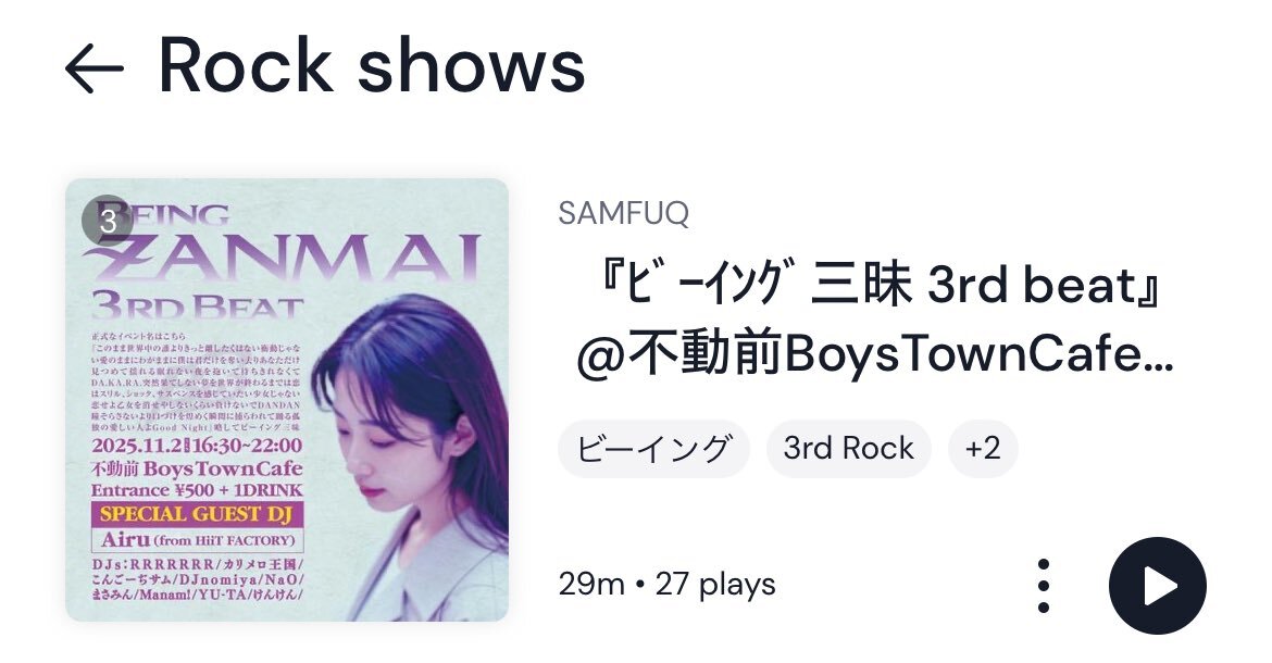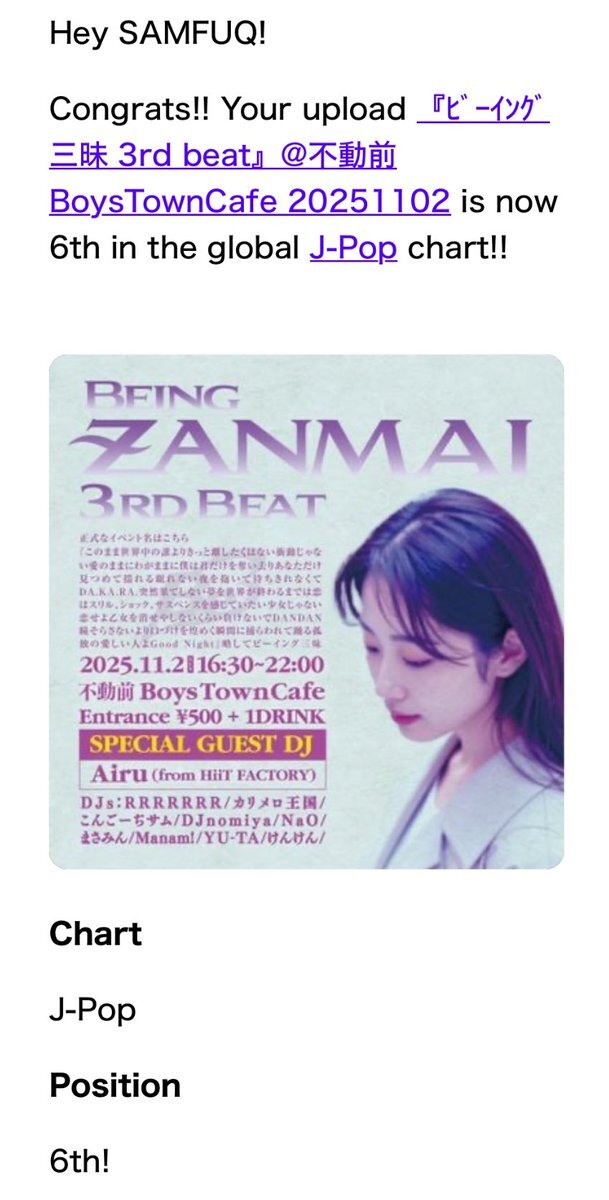 今夜のMixcloudランク確認 I'm 6th in the J-Pop chart 👉mixcloud.com/SAMFUQ/zanmai3/💿 #Jpop @mixcloudより J-POP6️⃣位、J.Rock3️⃣位に #ビーイング三昧 #KIXS #HiiTFACTORY #新浜レオン #森下由実子 #柳原愛子 #花リナ #小松未歩 #青いガーネット #チェリールイ #MANISH #倉木麻衣 #전혜선 とか pic.x.com/gQrqlxGrXD x.com/beingriderfrea…