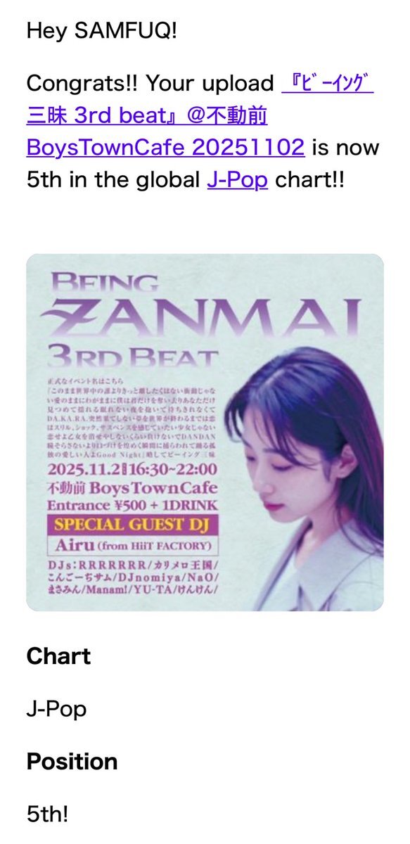 今夜もMixcloudランク確認 I'm 5th in the J-Pop chart 👉mixcloud.com/SAMFUQ/zanmai3/💿 #Jpop @mixcloudより J-POP5️⃣位、J.Rock2️⃣位へ #ビーイング三昧 #KIXS #HiiTFACTORY #新浜レオン #森下由実子 #柳原愛子 #花リナ #小松未歩 #青いガーネット #チェリールイ #MANISH #倉木麻衣 #전혜선 とか pic.x.com/cqDeaxOEKb x.com/beingriderfrea…
