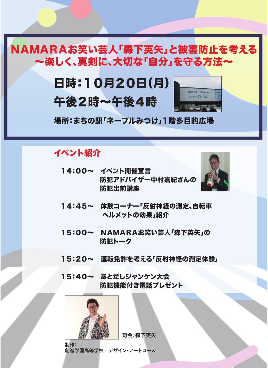 【イベント情報】#NAMARAお笑い芸人「#森下英矢」と被害防止を考える~楽しく、真剣に、大切な「自分」を守る方法~ 日時:10/20 14:00~16:00 場所:見附市 まちの駅 ネーブル見附 森下英矢さんの防犯トークのほか、体験コーナーなども開催予定! ぜひお越しください!! #見附警察署 pic.x.com/KSWH5fNp43