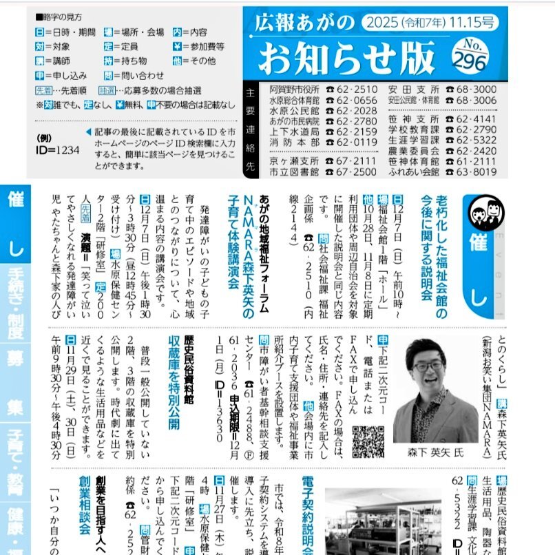 12月7日は、阿賀野市でモリゲさんを見よー 「笑って泣いてやさしくなれる発達障がい児 やたちゃんと森下家の人びとのくらし」 @morigemax1 #広報あがの #森下英矢 #モリゲチャット pic.x.com/eXFTbjah6t