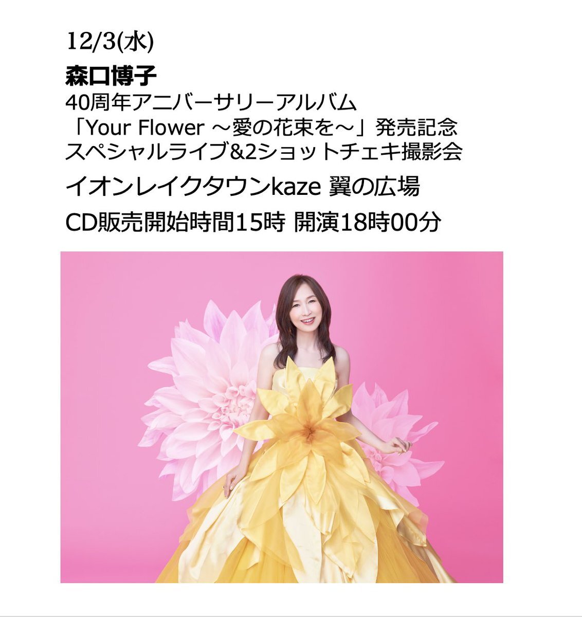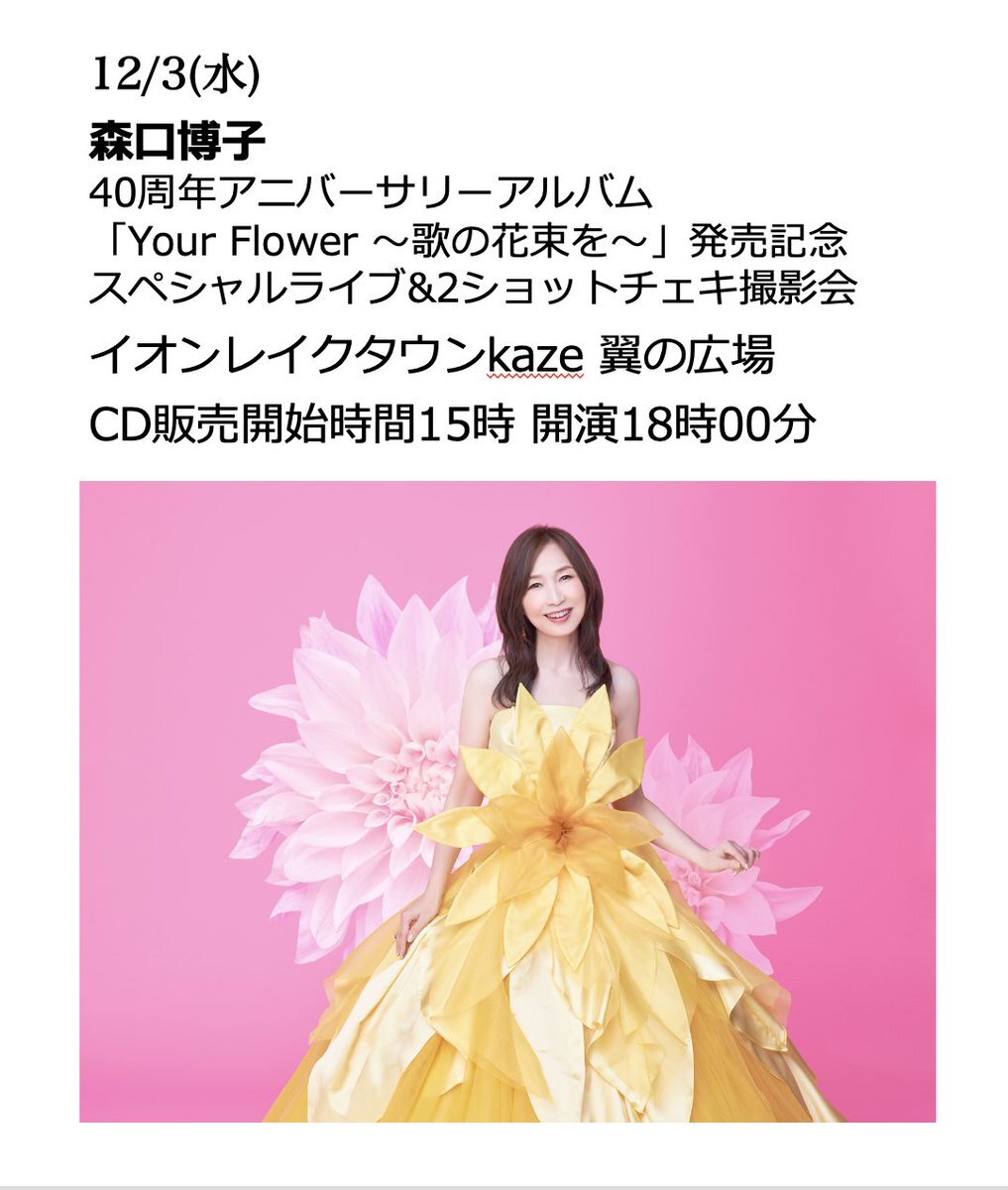 #森口博子 40周年アルバム『Your Flower ~歌の花束を~』発売日の12月3日(水)にイオンレイクタウンにてミニライブ&ツーショットチェキ撮影会の開催が決定いたしました! 👇詳しくはこちら kingrecords.co.jp/cs/t/t16600/ pic.x.com/ArMSOtNTvi