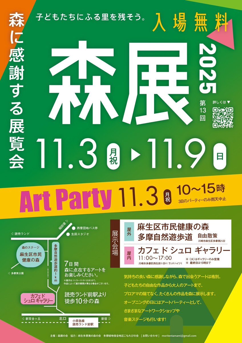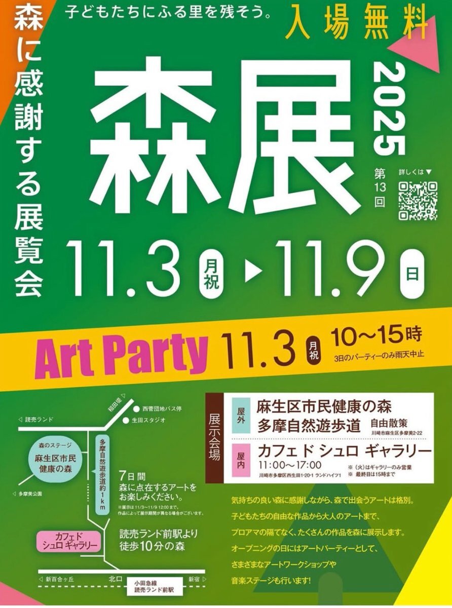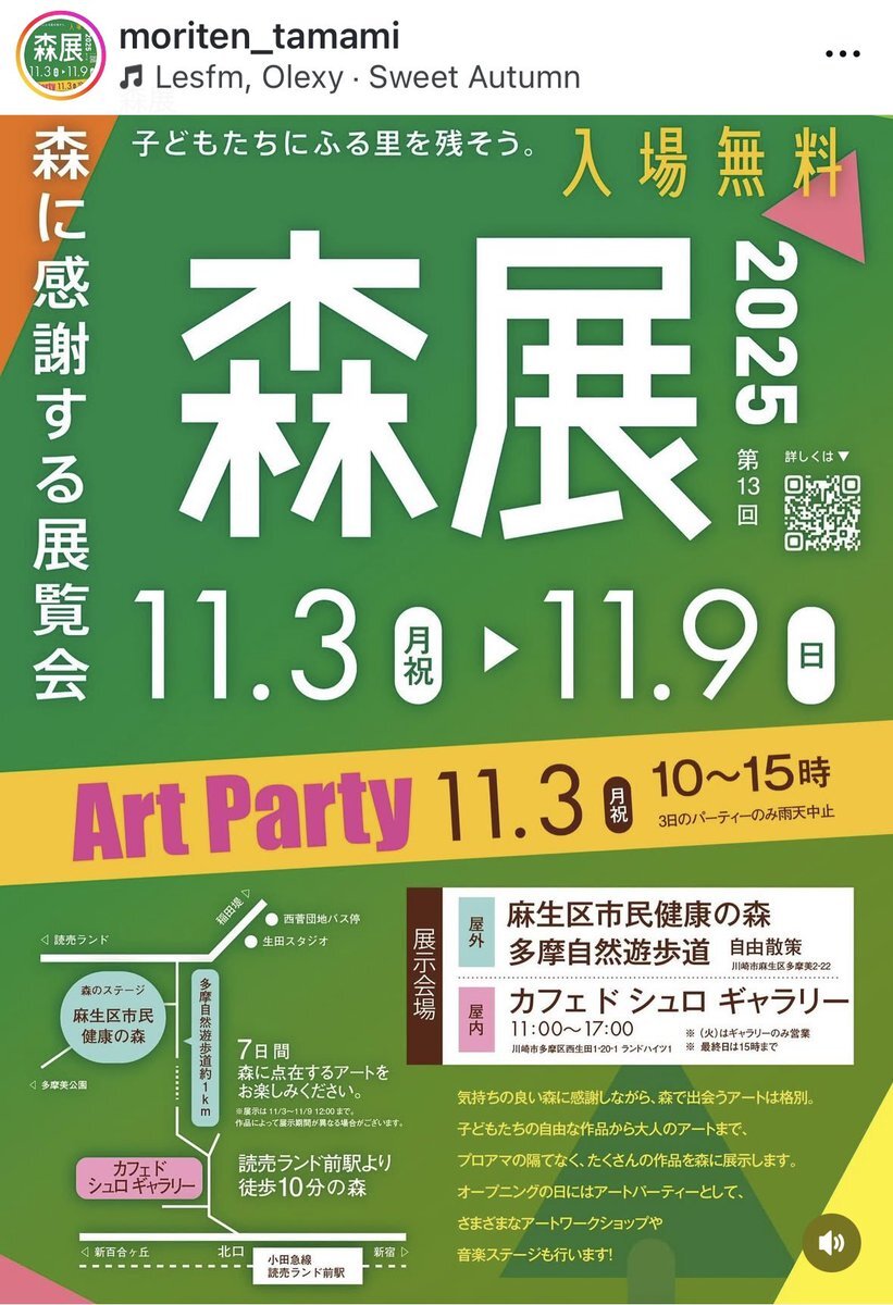 森の中の展覧会 森展は明日まで! ============= 2025年11月3日(祝月)〜11月9日(日) .屋内/カフェドシュロギャラリー. (11時〜17時 ) 屋外/麻生区市民健康の森. ============= #森展 pic.x.com/URjviMbzAq