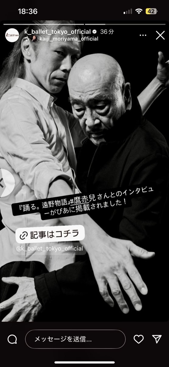 インスタのストーリーズからの写真になってしまうけど、本当絵になるお二人。 ご一緒出来ているのが、嬉しい。 お二人の対談記事も、また面白いです。 来月末、『踊る。遠野物語』です。 lp.p.pia.jp/article/news/4… #踊る遠野物語 #森山開次 #麿赤兒 pic.x.com/xSGQLedqaa