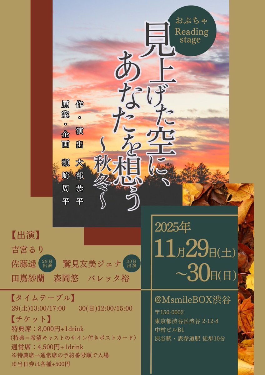 / #見上げた空にあなたを想う 25(土)11:00チケット販売開始🎟️ \ おぶちゃ Reading Stage 「見上げた空に、あなたを想う」 作・演出:大部恭平 @ofkyo 原案・企画:瀬崎周平 📗出演📗 吉宮るり @ru_ri0808 佐藤遥[29日出演] @Haruka26s 鷲見友美ジェナ[30日出演] @jiena_gaim 田嶌紗蘭 x.com/ofchachacha/st…