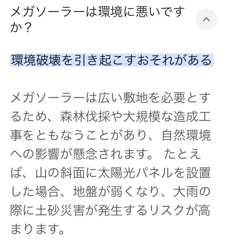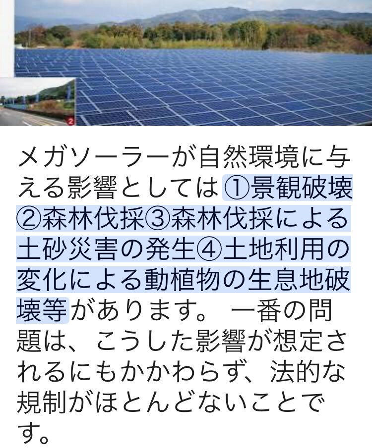 返信先:@nihonpatriotメガソーラの悪 ①国民に負担を強いる ②自然を破壊する ③温暖化を進める ④土砂災害を引き起こす ⑤外国に円が流れる ⑥撤去・廃棄方法を決めずスタート ⑦議員利権につながる ⑧ウイグルパネルを使用 ⑨無駄な送電線を増やす ⑩河川の氾濫が増える ⑪事業者破綻で巨大な廃墟が残る