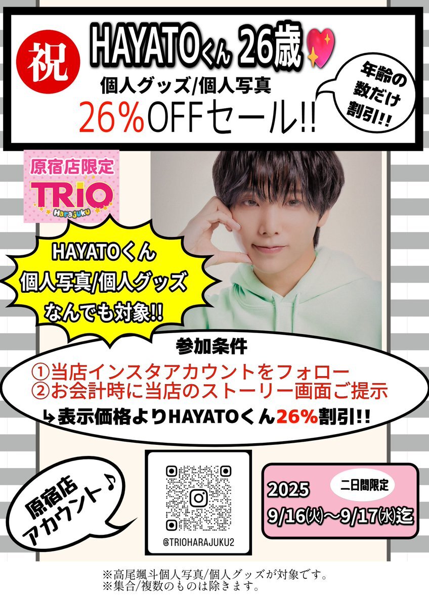 もう少しでHAYATOくん26回目のお誕生日… ということで個人グッズ&お写真全品26%OFFセール実施します!! 当店インスタ Instagram.com/trioharajuku2 フォロー&お会計時に当店ストーリー画面ご提示で割引対象、明日09/17㈬迄🎶 & マサヒロくん27%OFFセールは本日迄、是非是非🚃✨️ #高尾颯斗 #森次政裕 pic.x.com/08NzXpJQvQ