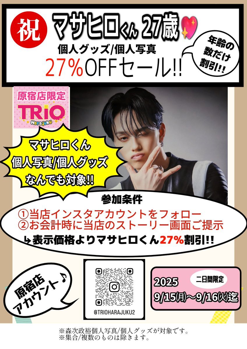#HAPPY_MASAHIRO_DAY お誕生日おめでとうございます🎉 27歳をお祝いしてこちら原宿2号店では…マサヒロくん個人グッズ&お写真27%OFFセール実施🎶 当店インスタ Instagram.com/trioharajuku2 フォロー&お会計時に当店ストーリー画面ご提示で割引対象🎶 明日09/16迄、よろしければ是非🚃 #超特急 #森次政裕 pic.x.com/kPOhwfSvpt