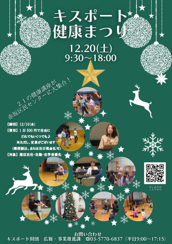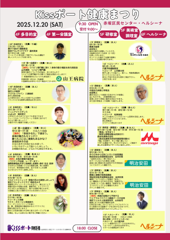 12/20(土)「Kissポート健康まつりat赤坂区民センター・ヘルシーナ」 申込み受付中! 締め切り:12/10(水) 費用:1日500円21講座いくつでも♪ ※定員あり 申込みはこちら↓ kissport.or.jp/event/info/?id… #キスポート #健康 #ヘルシーナ #森永 #明治安田 #山王病院 #三田病院 #TAC #瞑想 #かるた #ダンス pic.x.com/dfhYLlKQAL