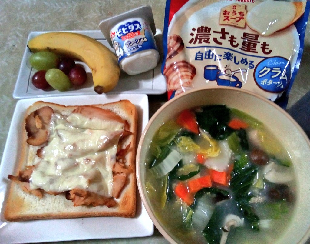 きょおもホカホカにゃ朝飯~ #味わい食パン +鶏チャーシュー&スライスチーズ→トースト♪ #クラムポタージュ(#おうちスープ) +白菜・小松菜・人参・しめじ・エリンギ バナナに葡萄に #森永ビヒダスヨーグルト 430k強 #朝ご飯 #朝ごはん #朝食 #ヤマザキ #ポッカサッポロフード pic.x.com/oxWnUZ9n0E