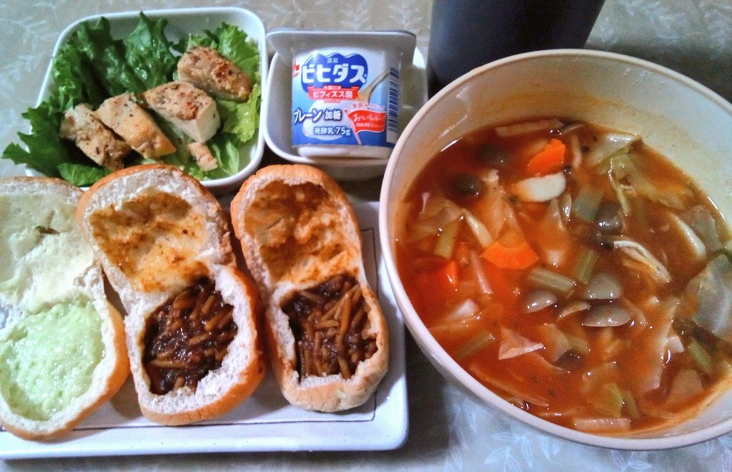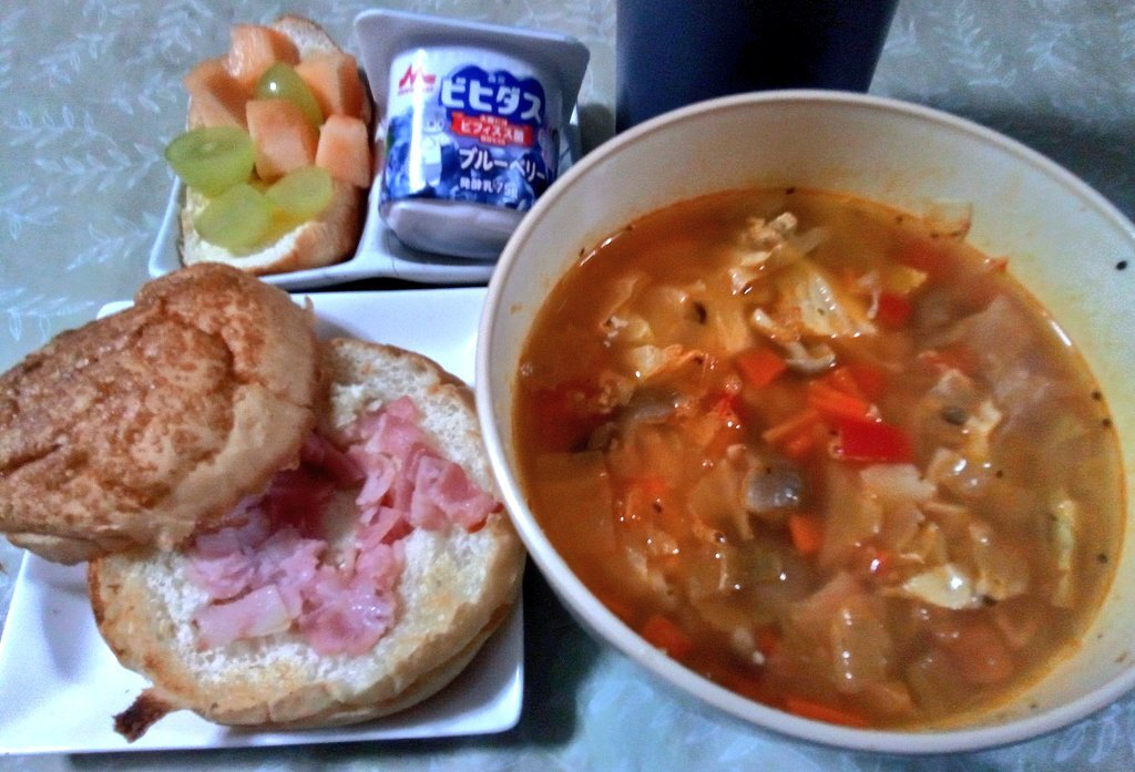 惣菜パンにゃ朝飯~ #チーズフォンデュパン +ベーコン→トースト! #ミネストローネ(#スープ生活) +残りベーコン&5種野菜と茸 #薄皮クリームパン +葡萄にメロン #森永ビヒダスヨーグルト(ブルーベリー) 490k弱 #朝ご飯 #朝ごはん #朝食 #フジパン #アスザックフーズ #ヤマザキ pic.x.com/QMQ5MIiZpl