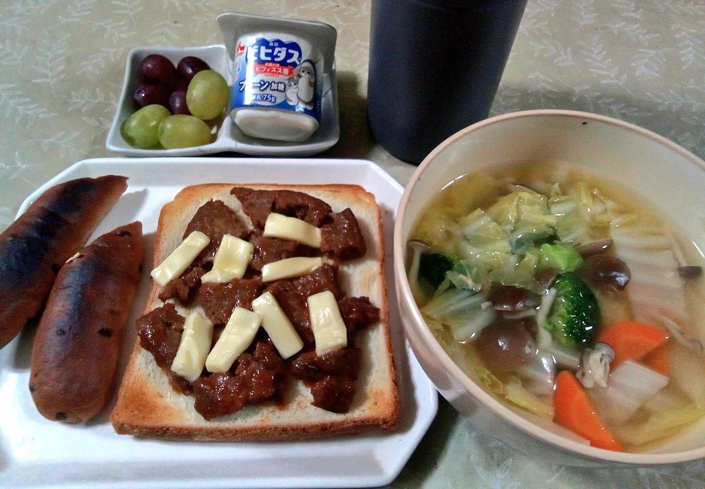 ホカホカにゃ朝飯~ #味わい食パン +#チキンハンバーグ+#ベビーチーズ #チョコチップスナック →トースト #オニオンスープ(コンソメ) +4種野菜と茸 葡萄に #森永ビヒダスヨーグルト 480k弱 #朝ご飯 #朝ごはん #朝食 #ヤマザキ #丸大食品 #六甲バター #ニコニコのり pic.x.com/6FzMpxRS4q
