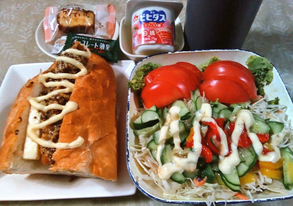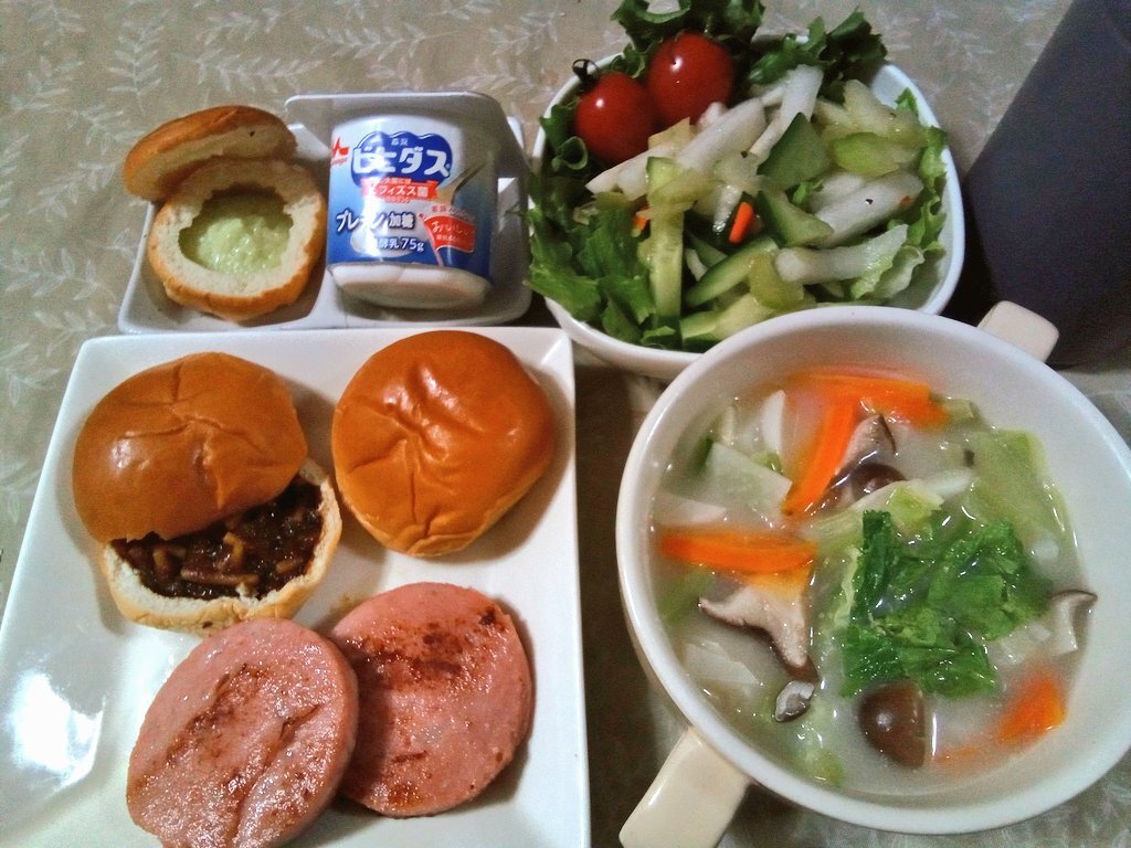 ジャンク?第二弾にゃ昼飯~ #薄皮カレー焼きそばぱん*2 #ボロニアソーセージ(焼w) #じゃがいもポタージュ(#おうちスープ) +5種野菜と茸 #薄皮シャインマスカットクリームパン #森永ビヒダスヨーグルト セロリのマリネ +Gリーフ胡瓜ミニトマト 570k弱 #昼ご飯 #昼ごはん #昼食 #ヤマザキ #伊藤ハム pic.x.com/MzdEVKZdkZ