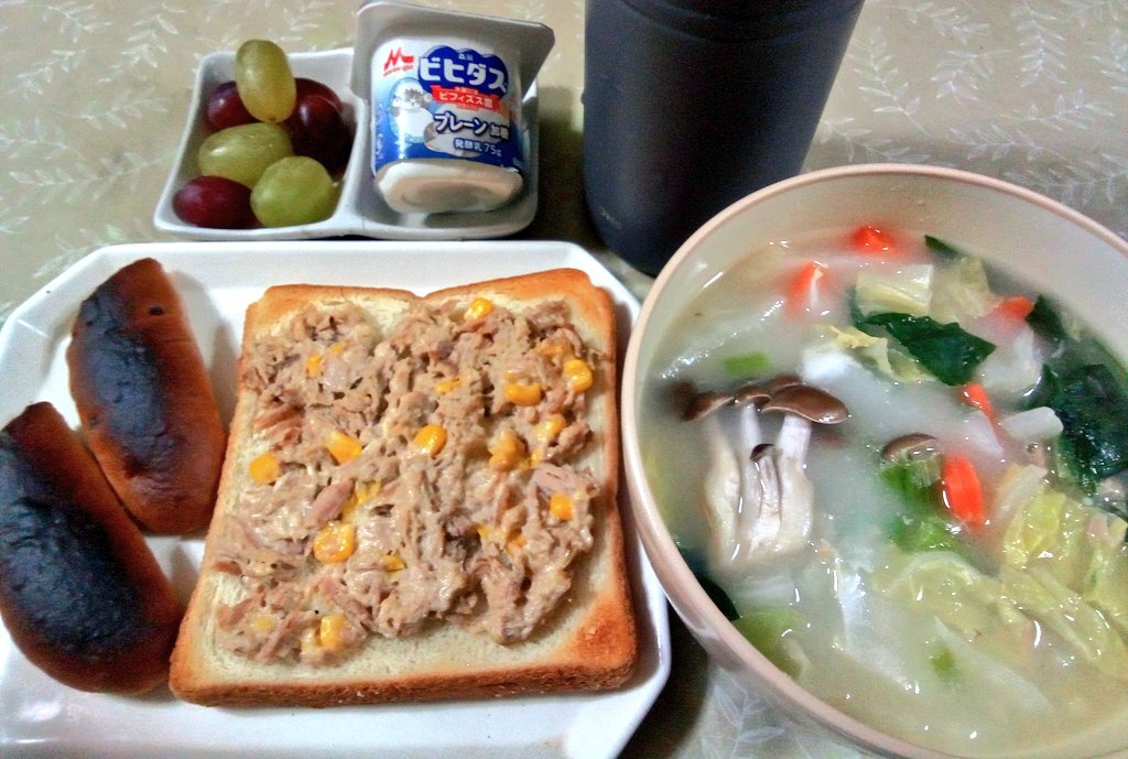 きょおもホカホカにゃ朝飯~😁 #味わい食パン +ライトツナフレーク +#コーンアンドマヨ(#キューピーパン工房) #チョコチップスナック →トースト♪ #クラムポタージュ(#おうちスープ) +残りツナ&4種野菜と茸 葡萄 #森永ビヒダスヨーグルト 460k強 #朝ご飯 #朝ごはん #朝食 #ヤマザキ pic.x.com/pUG9yemp63