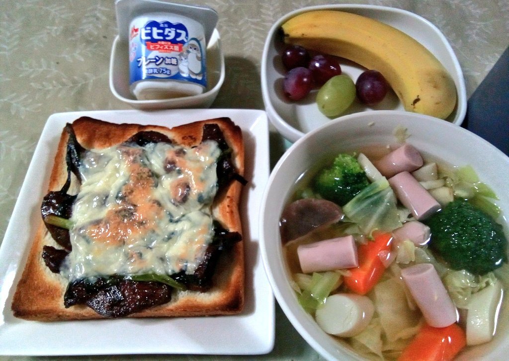 ホカホカ😁にゃ朝飯~ #味わい食パン +レバニラ&スライスチーズ→トースト♪ なんちゃってポトフw #おさかなのウインナー +キャベツ・人参・ブロッコリ・エリンギ+#コンソメの素 #森永ビヒダスヨーグルト バナナに葡萄 490k強 #朝ご飯 #朝ごはん #朝食 #ヤマザキ #ニッスイ pic.x.com/uyfEJwrba0