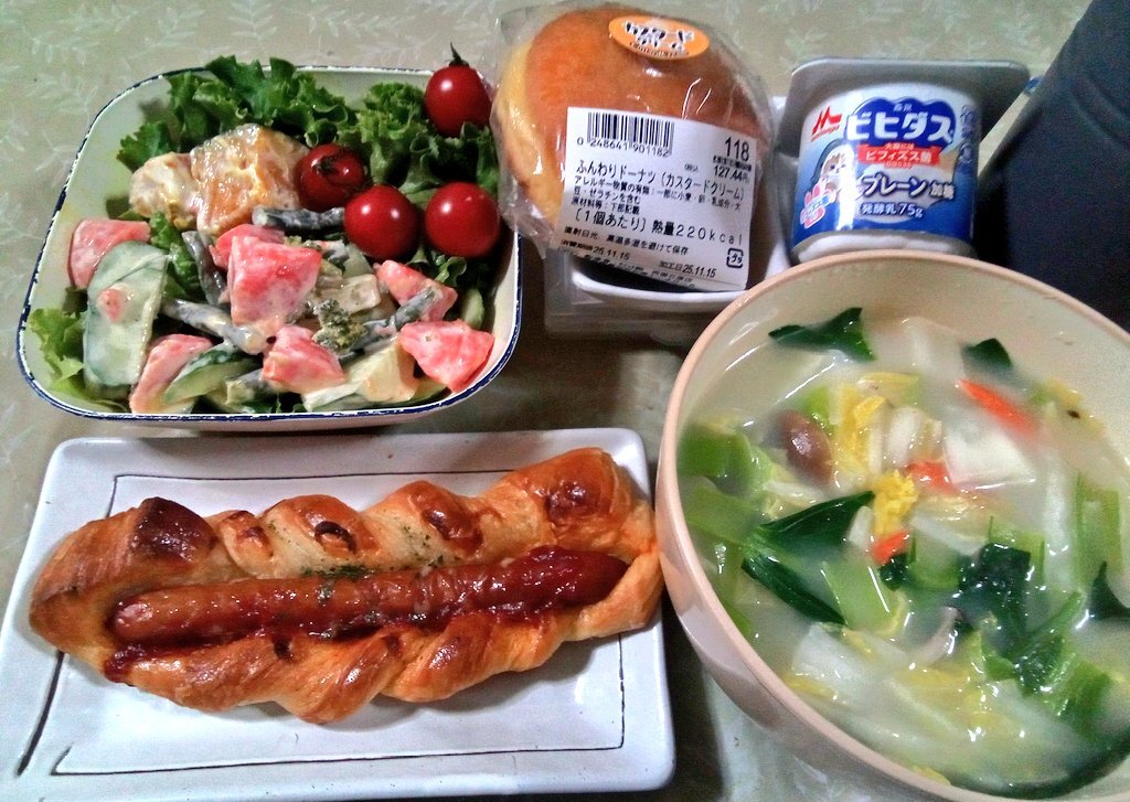スーパー惣菜(🍞&サラダw)で晩飯~ デニッシュ粗挽きウインナー 半日分の緑黄色野菜サラダ +Gリーフ胡瓜ミニトマト #おうちスープ(#じゃがいもポタージュ) +4種野菜と茸 ふんわりドーナツ(カスタードクリーム) #森永ビヒダスヨーグルト …710k弱😅 #晩ご飯 #晩ごはん #夕食 #サミットストア pic.x.com/TwnmEmzDts