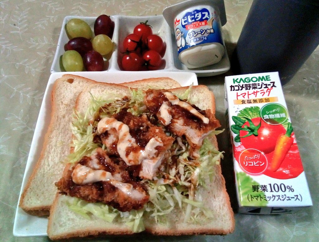 朝からカツサンド!の開き(蓋🍞付)にゃ朝飯~ #味わい食パン+キャベツ+チキンカツ +#キューピータルタルソース +#ブルドック中濃ソース #カゴメ野菜ジュース(トマトサラダ) 葡萄にミニトマト #森永ビヒダスヨーグルト …510k強😅(朝の目標値500k内…) #朝ご飯 #朝ごはん #朝食 #ヤマザキ pic.x.com/yaNt185w4B