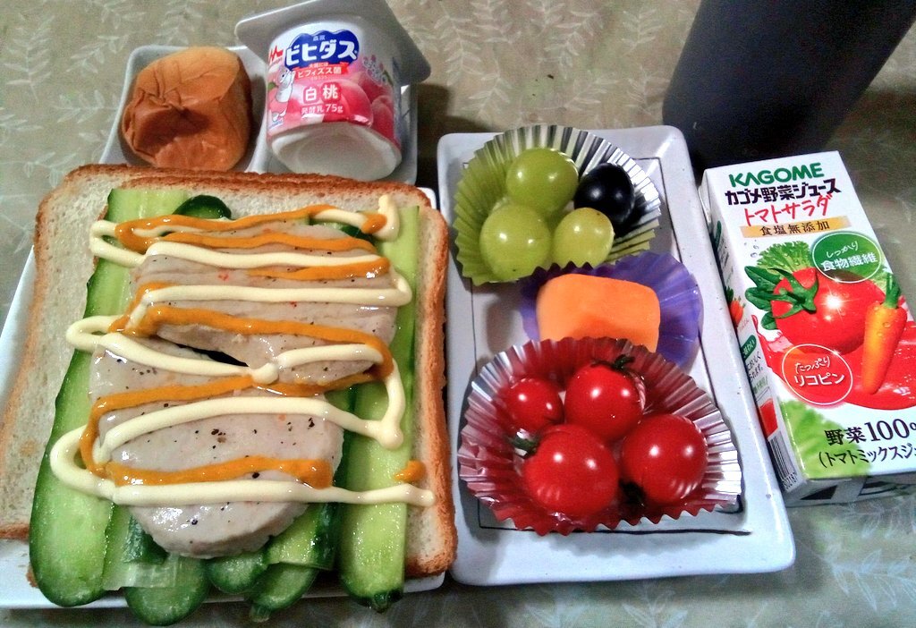 鶏きゅうサンドの開きにゃ昼飯~ #食パン*2 +胡瓜+#ローストチキン(ハーブ)&マヨマスタード #薄皮クリームパン #森永ビヒダスヨーグルト(白桃) ミニトマトにメロンに葡萄 #カゴメ野菜ジュース(トマトサラダ) 590k弱 #昼ご飯 #昼ごはん #昼食 #フジパン #ヤマザキ #伊藤ハム pic.x.com/i0uCHGMxi0