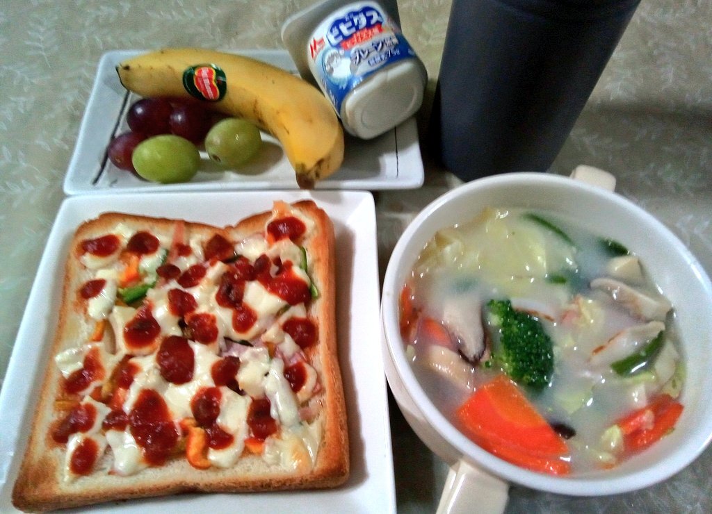 ホカホカにゃ朝飯~ #味わい食パン +ベーコン・ピーマン・エリンギ&スライスチーズ +#KAGOME具だくさんピザソース →トースト♪ #じゃがいもポタージュ(#おうちスープ) +ベーコン&5種野菜と茸 バナナに葡萄に #森永ビヒダスヨーグルト 440 #朝ご飯 #朝ごはん #朝食 #ヤマザキ # pic.x.com/NKA8AtUXM3