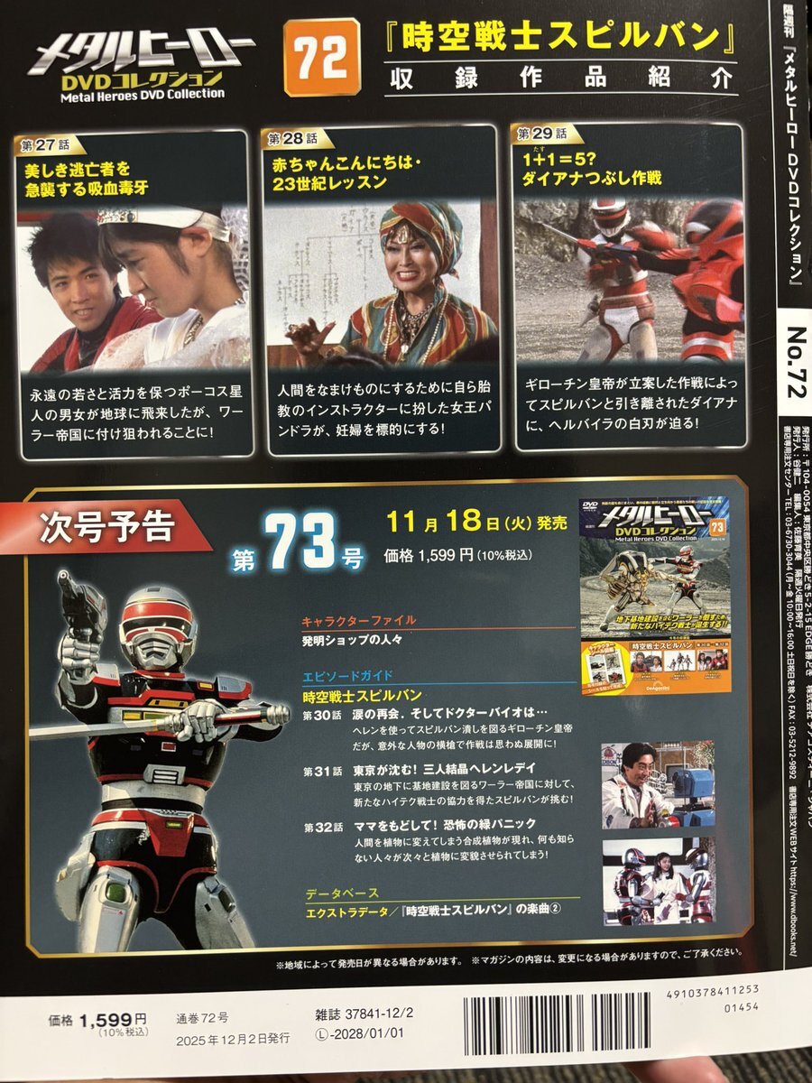 本日は会社帰りに本屋さん寄って買って来ました。#メタルヒーローDVDコレクション 72号 #時空戦士スピルバン 27〜29話 今月末には淑女会でヘレン役の #森永奈緒美 さんにお会い出来るのでワクワクしております☺️ pic.x.com/4denJewbFb