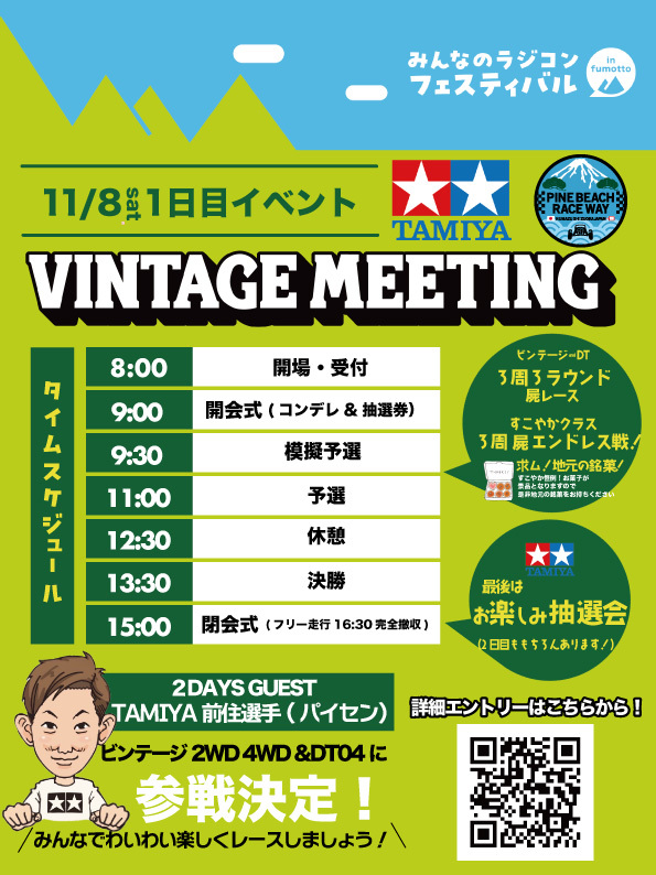 .みんなのラジコンフェスティバル1日目詳細決定😆🔥 詳細+エントリーはこちらから carnosa.net/25110809rcfes/ 1日目TAMIYAビンテージミーティングの詳細が決まりましたー🙌 ビンテージ2WD 4WDとDTは「3周3ラウンド屍レース!」 そしてすこやかクラスは