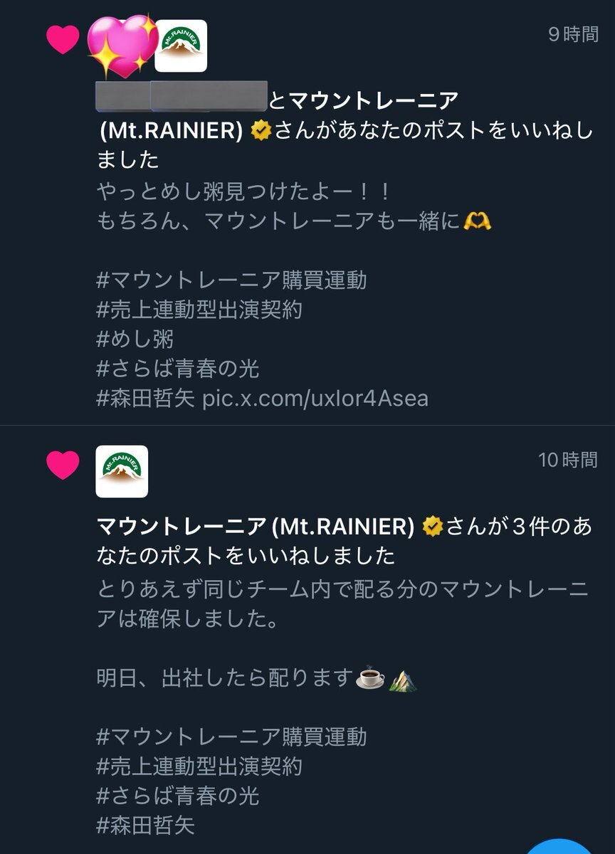 会社でマウントレーニア配る時 事情を知ってる人 「頑張ってるねw」 「私も買うわ!」 「良い推し活ですね☺️」 事情を知らない人 「…え?いいんですか?!」 「なんで??」(困惑) 「キャンペーンのやつですか?」 #マウントレーニア購買運動 #売上連動型出演契約 #さらば青春の光 #森田哲矢