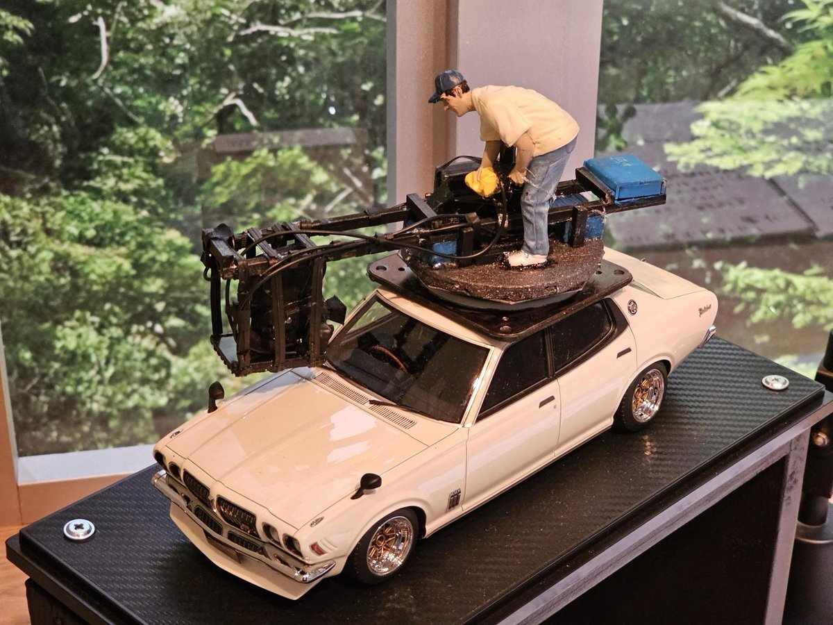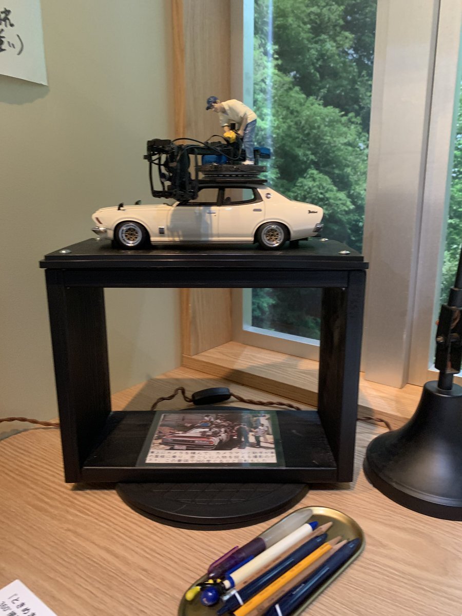 #森田芳光展 展示品に注目!④ 『ときめきに死す』のクライマックス近く、主演3人が乗った車の周囲を360度回転するシーンの仕掛けを約18分の1のスケールで再現した模型。今なお尋ねられるという質問への答えとして、本展のために装置制作のプロが製作しました。その際の台本や現場スチルも展示中です。 pic.x.com/l3I9elPH4D