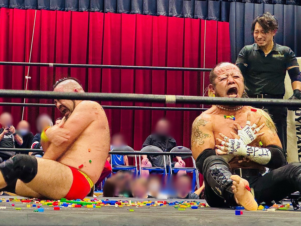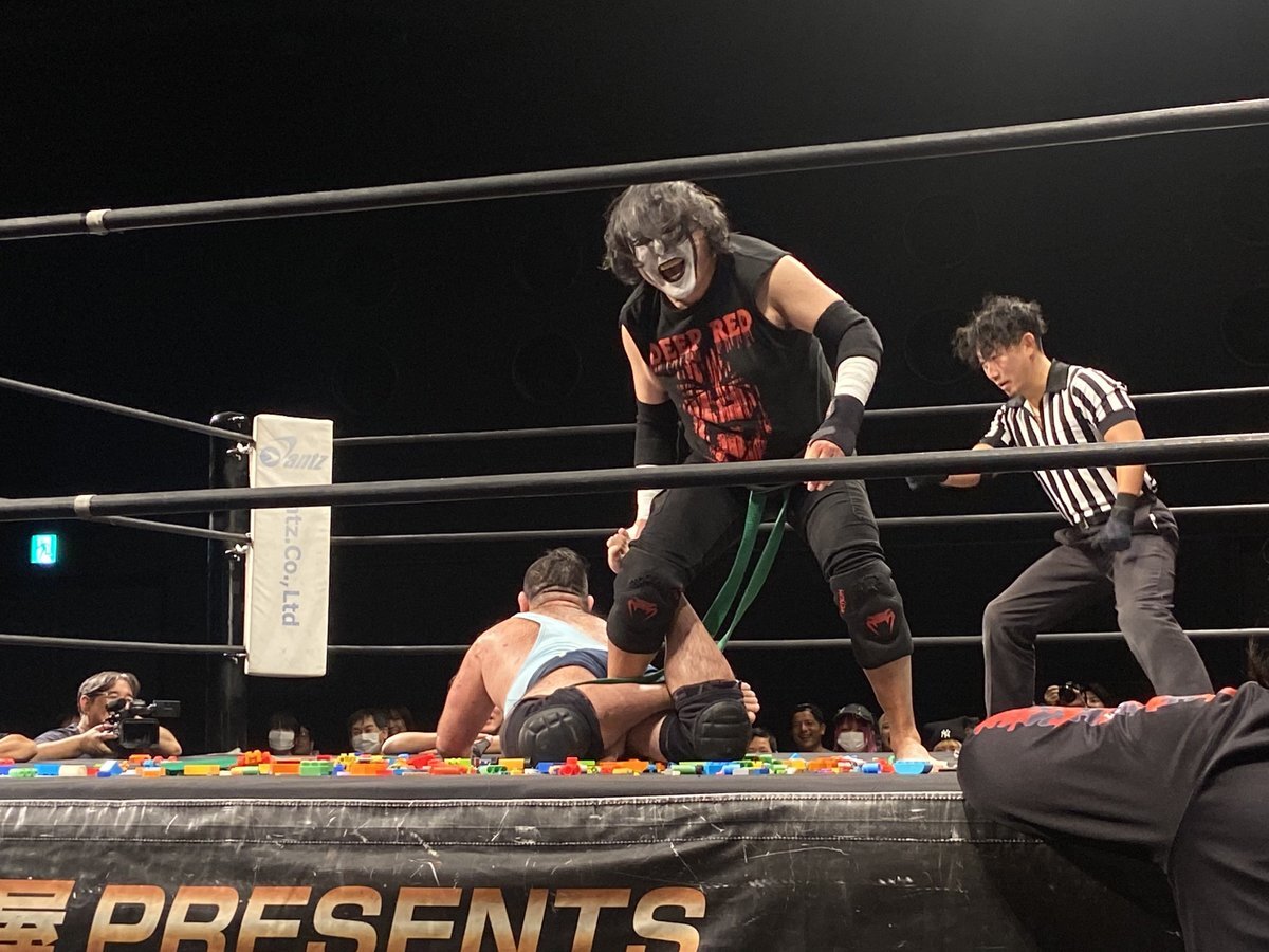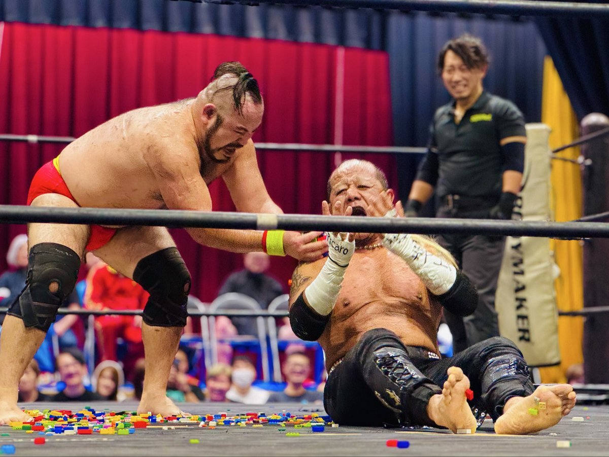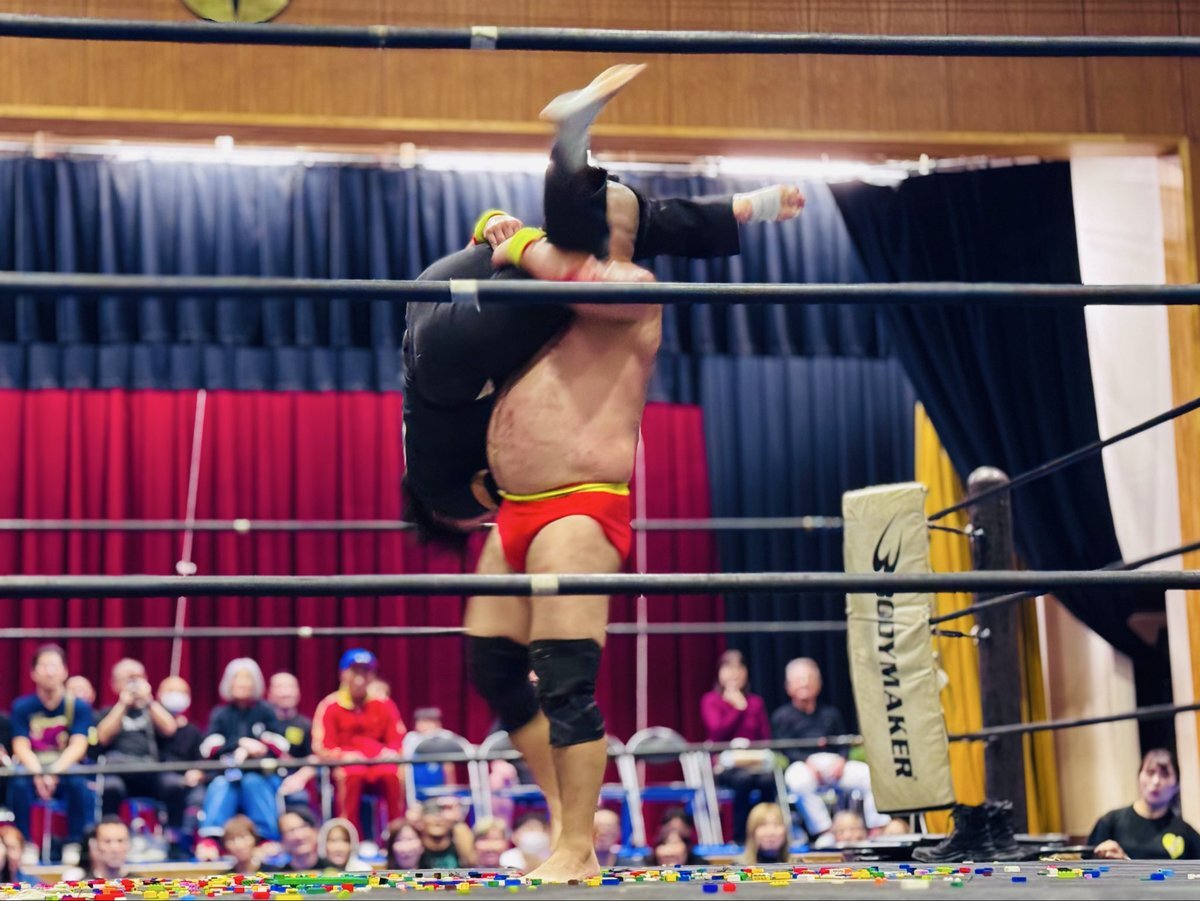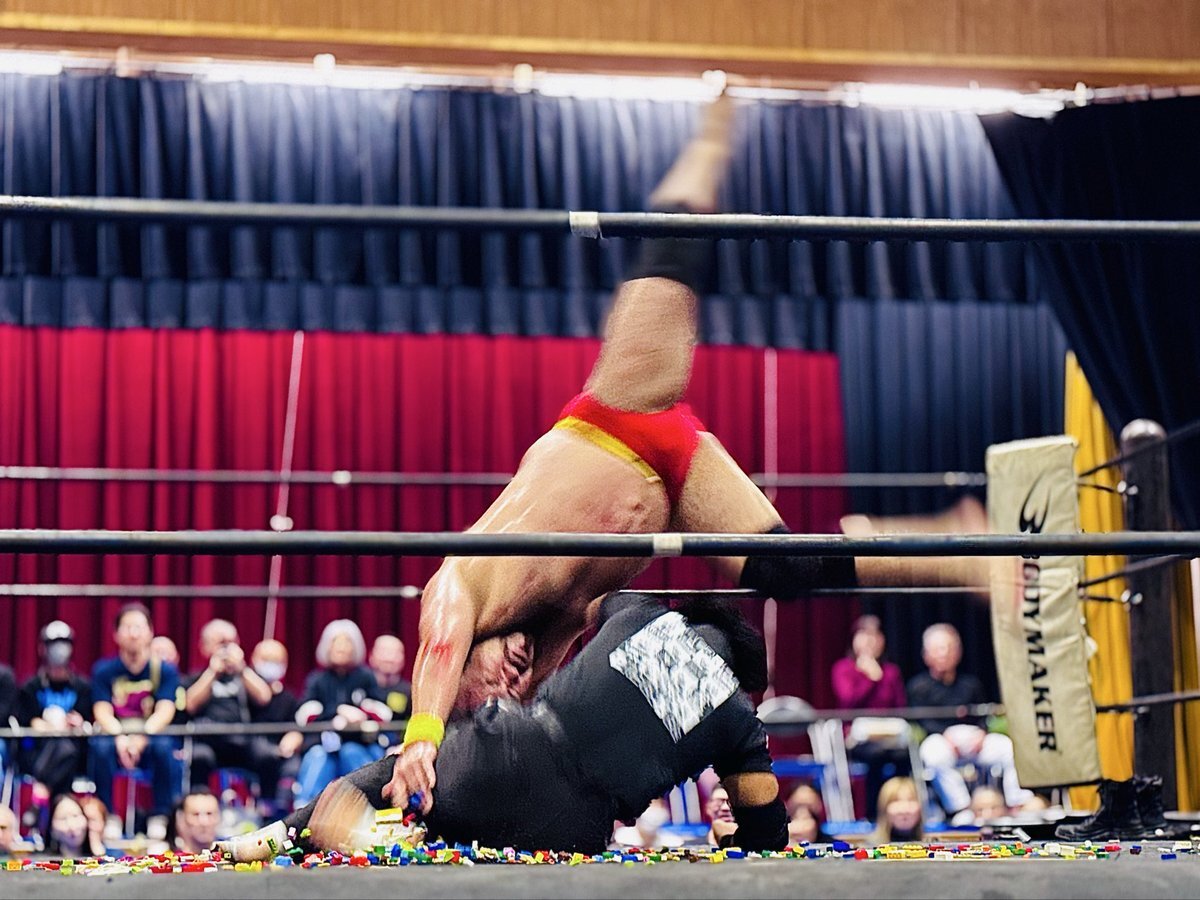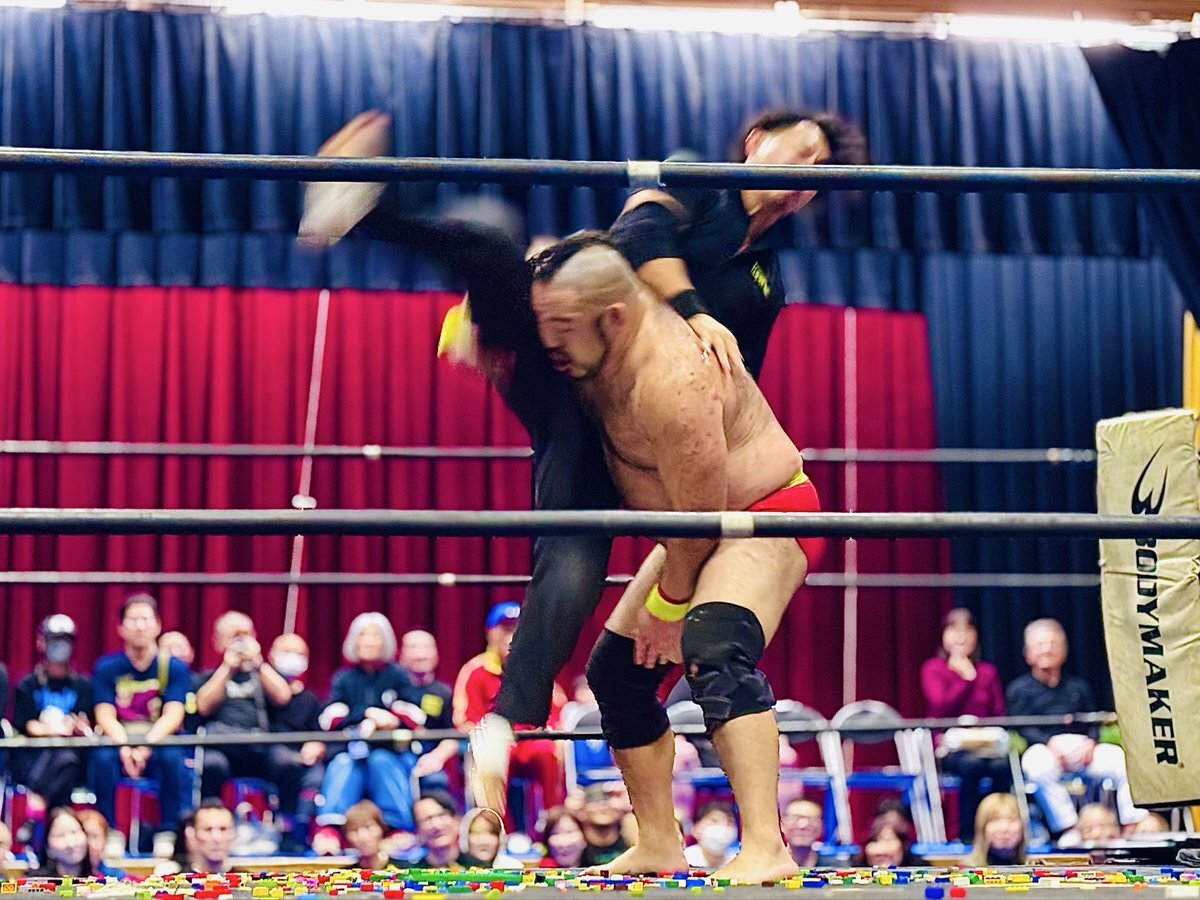 ブロック玩具が散らばるリングへ向け パールハーバースプラッシュ💦 植木さんのやられっぷり大好き🤣❣️ (2025.10.19 アクティブ・スクウェア・大東) #pw_freedoms #葛西純 #植木嵩行 pic.x.com/fYeKnhqQCv
