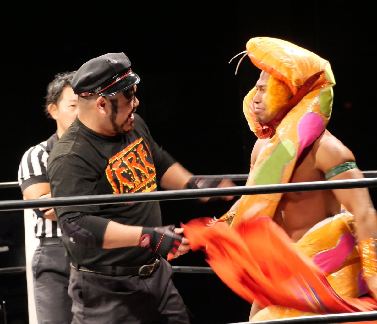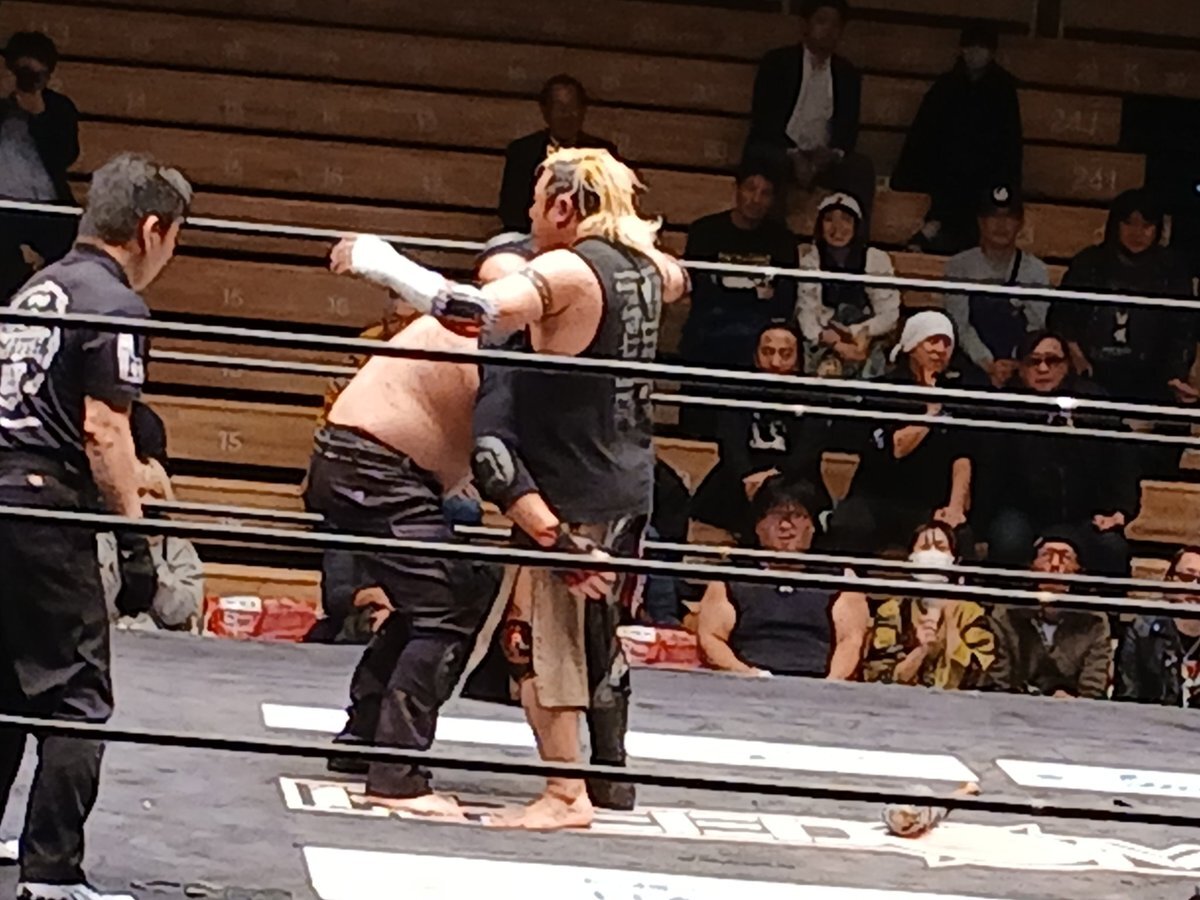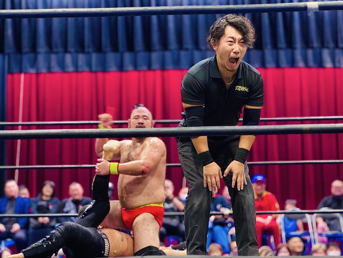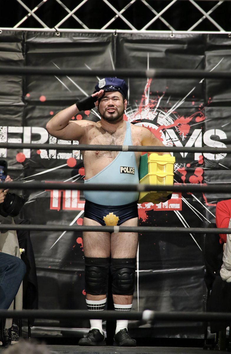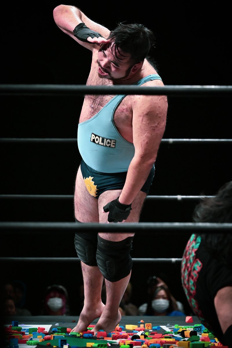 吉野さんを投げようとして失敗、飛び越えた先にはLEGO...!!! ムキムキレフェリーが強過ぎる😂😂 #植木嵩行 選手 #吉野恵悟 レフェリー 2025.10.19 #pw_freedoms pic.x.com/ZktvKxpLU7