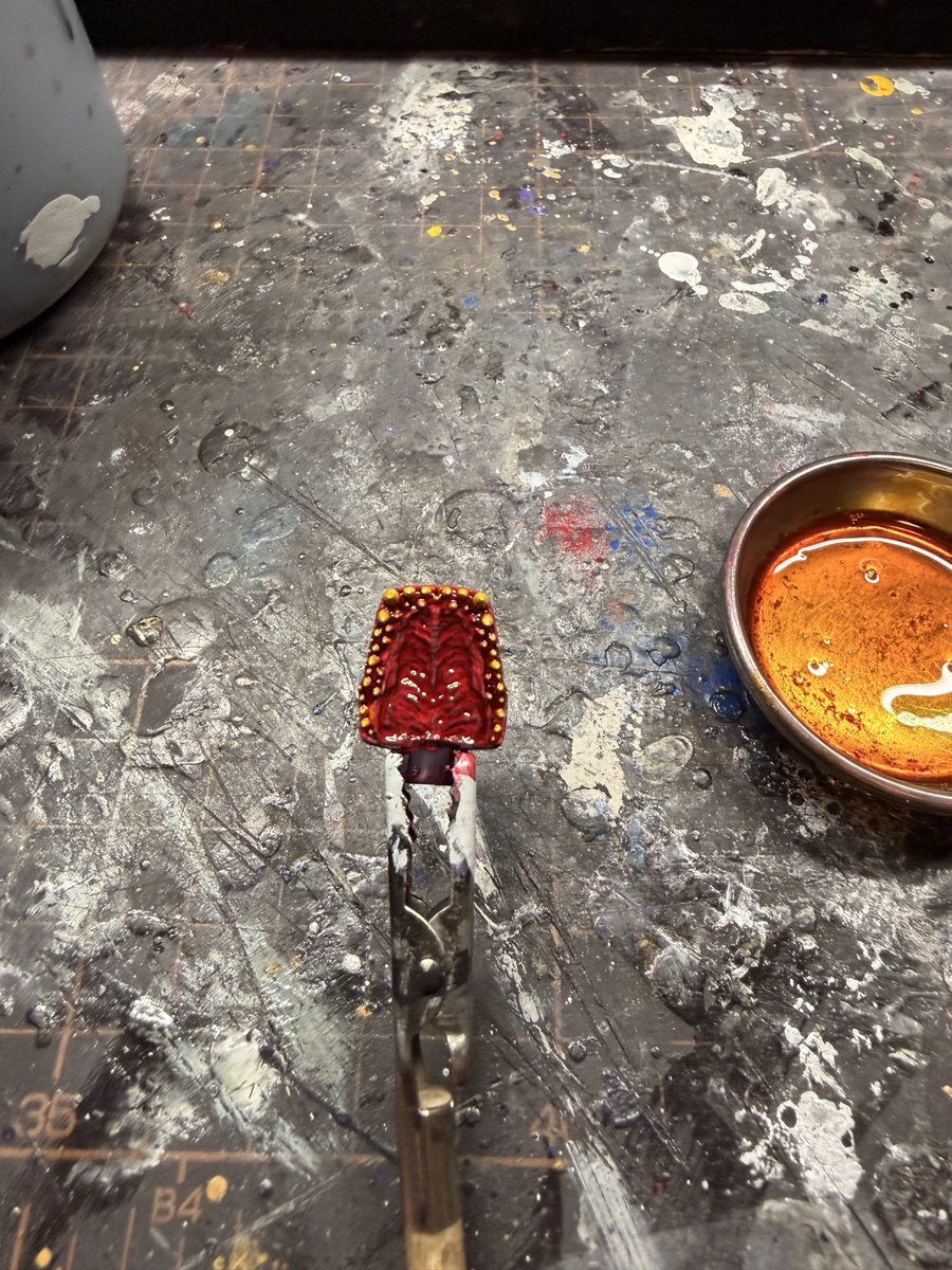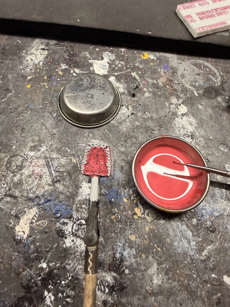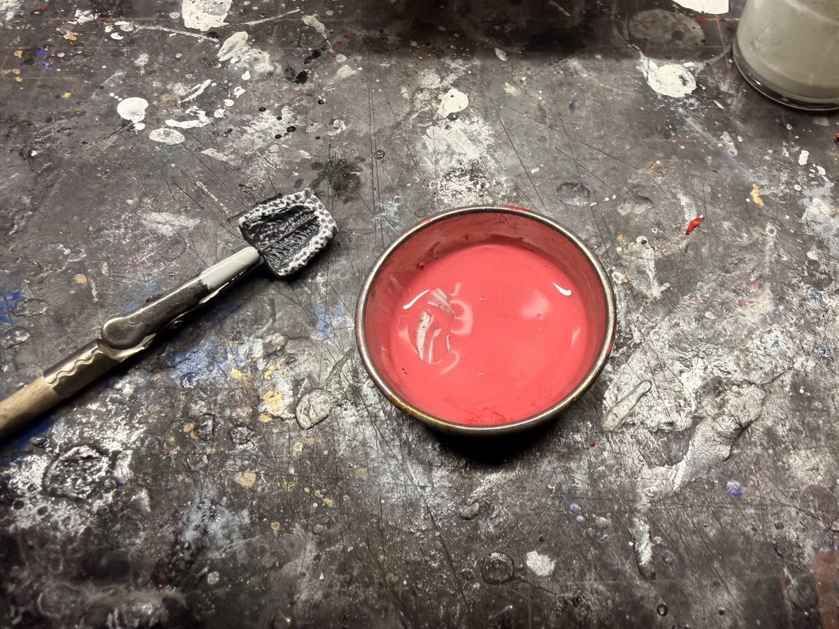 さっきのホワイトにレッドを入れて、ポリグリップ作ります。 薄め液入れて、気持ちシャバシャバ。 浸透力つかって塗り塗り。 #ゴジラ #コトブキヤ #筆塗り #極獣造形 pic.x.com/Krjvh4DiBT