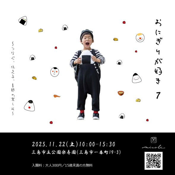🍙11/22(土)10:00-15:30『 #おにぎりが好き7 』🍙 . ✨ #楽寿園菊まつり2025 イベント情報第7弾‼️CRAFT&FOODイベント@ #楽寿園 ✨ . 美味しいおにぎり、かわいいおにぎり雑貨などのお店が並びます🍙 . ⁡☆詳細はこちら✨↓ instagram.com/eventnicoli?ig… . #三島市 #学生証で入園無料 #楽寿園 pic.x.com/CbOJg379nH