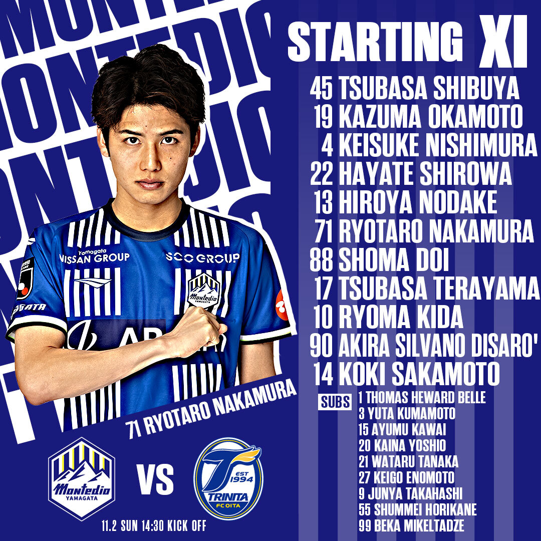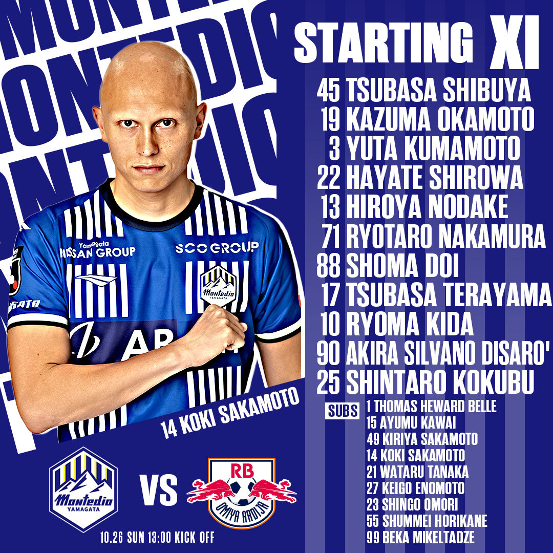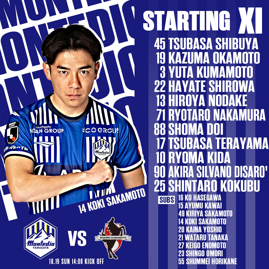 【#ホーム熊本戦】 メンバー発表‼️ GK 渋谷飛翔 DF 岡本一真 熊本雄太 城和隼颯 野嶽寛也 MF 中村亮太朗 土居聖真 寺山翼 FW 氣田亮真 ディサロ燦シルヴァーノ 國分伸太郎 SUBS 長谷川洸 川井歩 坂本稀吏也 坂本亘基 吉尾海夏 田中渉 榎本啓吾 大森真吾 堀金峻明 👇詳細👇 montedioyamagata.jp/match/p/202510…