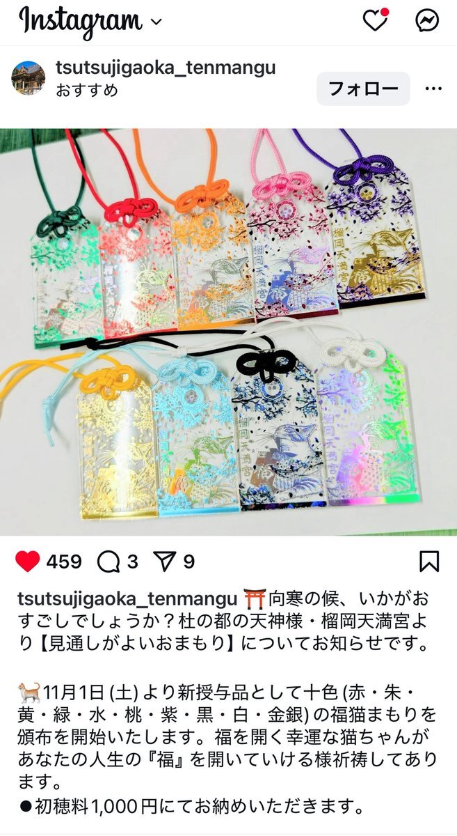 #拡散希望 】 我らが榴岡天満宮にて猫まっしぐらなキラキラ御守りが登場。全十色を取り揃えて11月1日(土)より榴岡天満宮にてお取り扱いとのこと。 ※わたくしほぼ天満宮の裏手にいるんで写メ撮ってきました。 #仙台市 #榴岡天満宮 #御朱印 #猫好きさんと繋がりたい #榴岡公園 #んだんだずんだ pic.x.com/GsmDUT156C