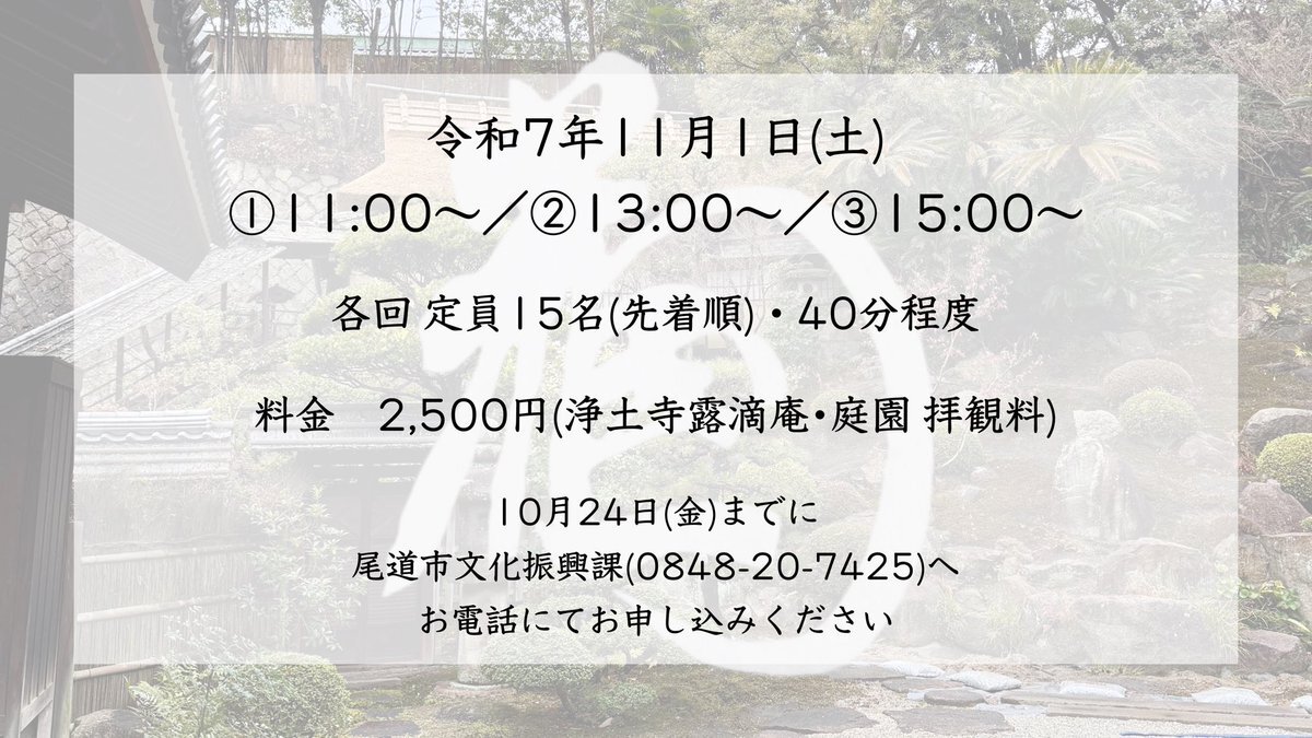 【イベント情報】 重要文化財浄土寺露滴庵・名勝浄土寺庭園特別公開 🗓令和7年11月1日(土) 🕰①11:00~②13:00~③15:00〜/40分程度 💰2,500円/人 詳しくは⬇️ nihonisan-onomichi.jp/news/informati… #日本遺産 #尾道 #箱庭的都市 #村上海賊 #北前船 #構成文化財 #浄土寺 #特別公開 #日本遺産認定10周年 pic.x.com/jyKSjtOI8T