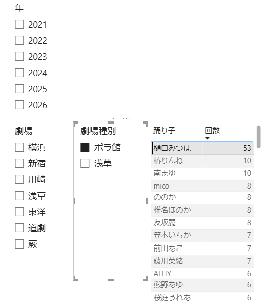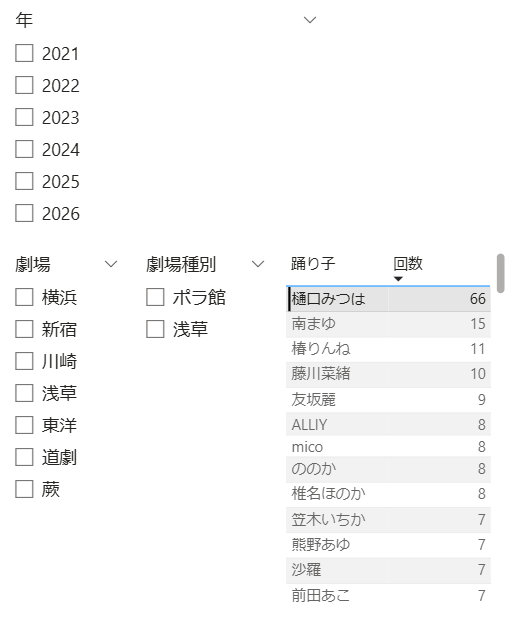 BIの勉強ついでに過去の共演回数集計(1頭予定まで)を作ってみた 1位はやはりのみなまゆ、上位は意外と最近ご一緒じゃないなという方々が多め、なおぴが怒涛の急上昇中 #樋口みつは pic.x.com/ptzqydCQwN