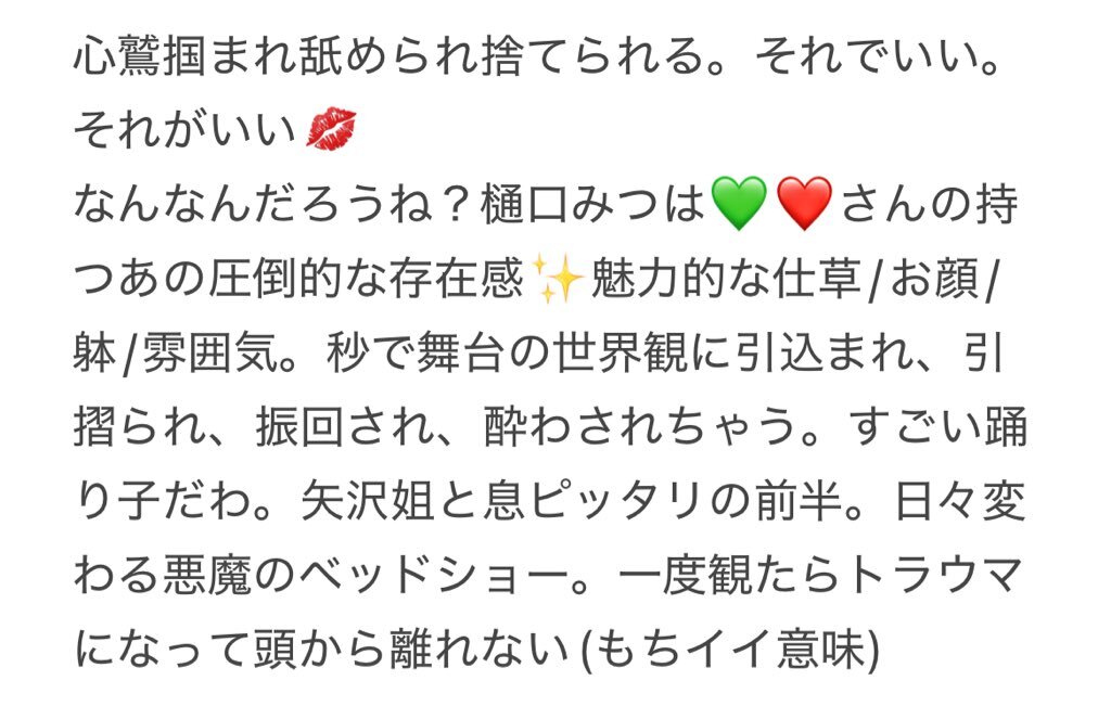 なんなんだろうね?#樋口みつは💚❤️さんの持つあの存在感✨魅力的な仕草/お顔/躰/雰囲気。秒で舞台の世界観に引込まれ、引摺られ、振回され、酔わされちゃう。すごい踊り子だわ。姐と息ピッタリの前半。日々変わる悪魔のベッドショー。一度観たらトラウマになって頭から離れない。ラストがまたいいのよ