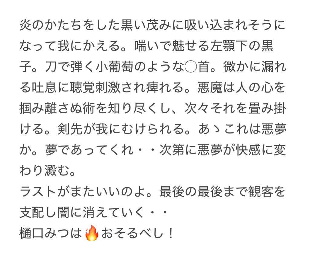 予想が一番難かった可愛/儚/アンニュイ/小悪魔なんでも見事に演じる🖤#樋口みつは⚔️いやはや「妖刀」見事だった。一期とは別物。侍を操り◯した後、盆に上がって場内観客を操り支配していく。もう観客はメロメロ彼女の意のままエロエロボディに心鷲掴まれ舐められ捨てられる。それでいい。それがいい💋 x.com/higuchi_mitsuh…