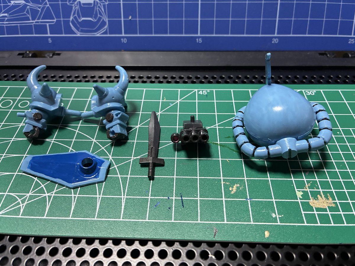 こんばんは🌇今日はグフカスタム塗装再開でございます🙂↕️。腕と武装を塗装しましたよ。武器はガンメタルでばっちりきめました!センサーはピンクに。シールドは青と水色に塗装しました☺️!次回は胴体と足です。 #模型サークルMPEG #おもちゃライフ pic.x.com/kZjUIf0lGk