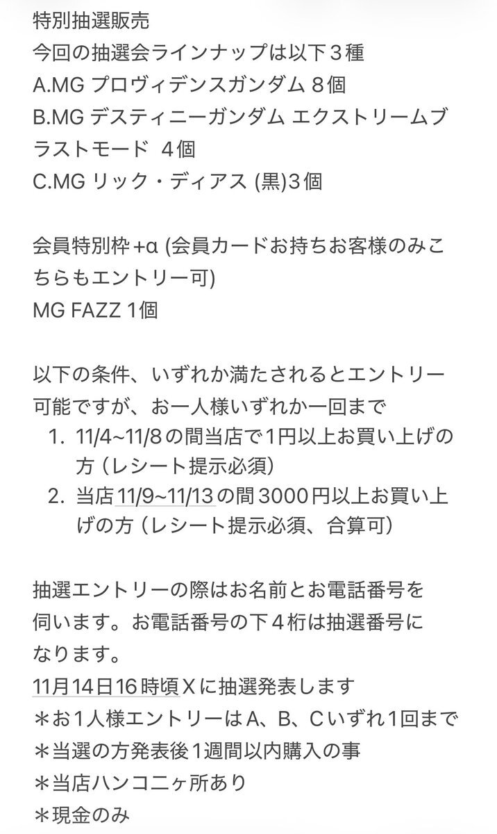HOBBYLAND秋葉原 特別抽選販売 ラインナップと条件は画像でご確認ください 会員様のみ+αあります 店頭受付は11/9 12時から *お電話での受付は不可 #HOBBYLAND #秋葉原 #模型屋 #ガンダム pic.x.com/jcWmfto3Ga