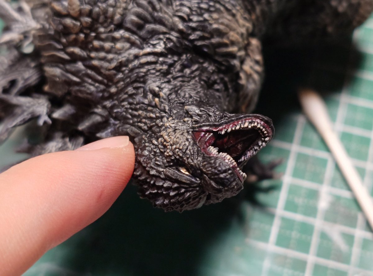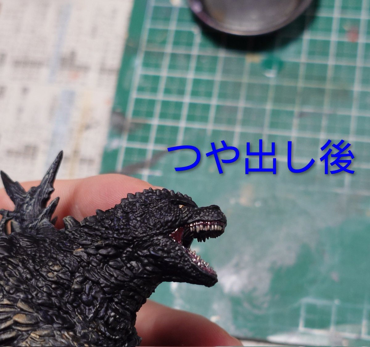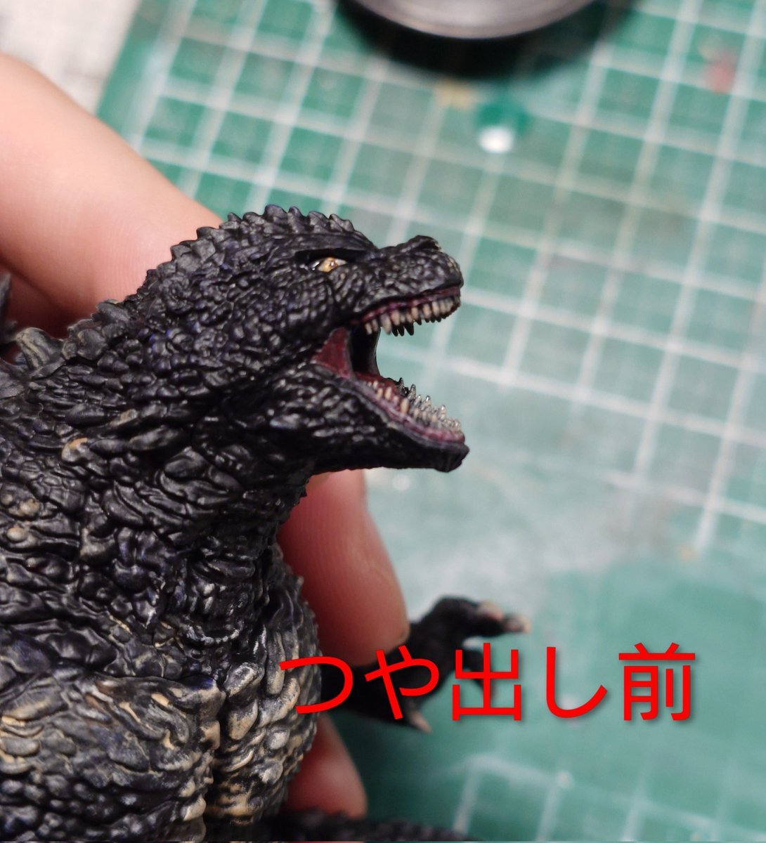 ゴジラの目と口内を艶あり仕上げに。 タミヤのつや出しニスを使用。アクリル系なので、洗浄は水性ホビーカラーの薄め液で対応。 艶を入れるだけで、生き物感がぐっと出る👍 #ゴジラマイナスワン #プラモデル #模型製作 pic.x.com/uqtc6oYe8q