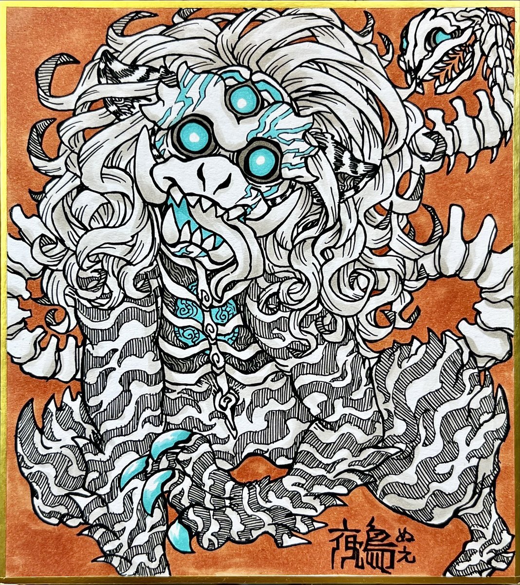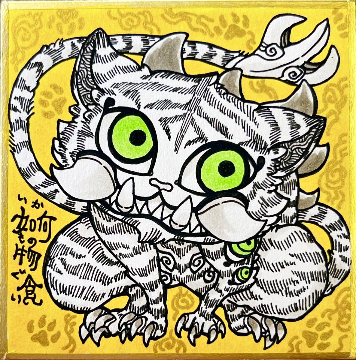 ミニ原画色紙『如何物食(いかものぐい)』 人喰い虎の化け物を守り神として崇めていた山間部の村があった。 村から災いを避ける代わりに、村人を生贄として捧げていたという…現在では廃村となり信仰は途絶えている。 #創作伝承妖怪 #創作 #妖怪 #イラスト #模様 # #yokai #illustration #illust pic.x.com/hVlWnKiUgL