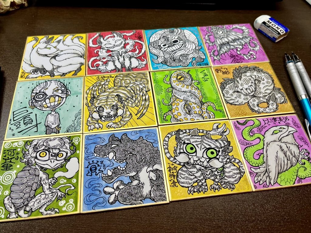 ミニ原画色紙は一旦12枚で打ち止め✍️ 九尾の狐、火車、煙々羅、唐傘、 巨頭オ、土蜘蛛、くねくね、野槌、 河童、覚、如何物食、以津真天 #創作 #妖怪 #イラスト #模様 # #色紙 #yokai #illustration #illust #art pic.x.com/Ow6FU4C2nj