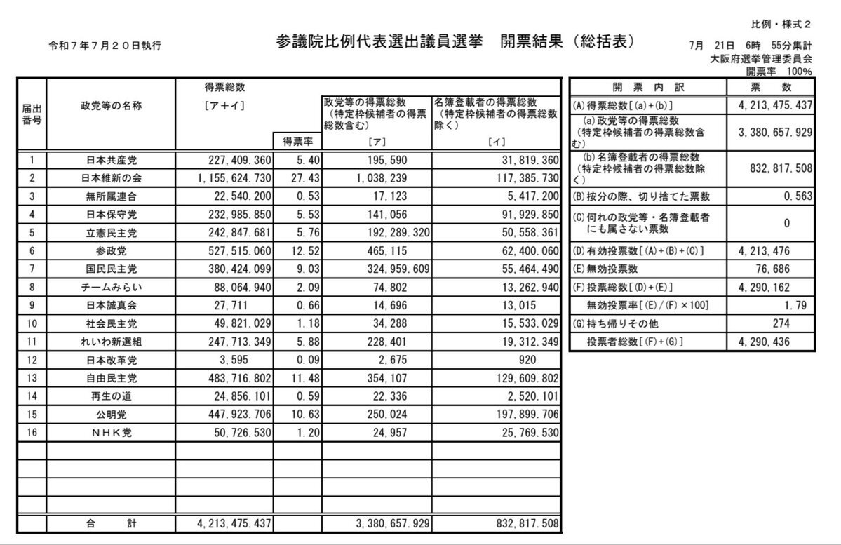 大阪府議会の維新議席占有率は64.5% じゃあ維新の大阪府での得票率は64.5%あるのか調べたら 大阪府の各選挙区の維新得票率が公的にまとまってなかったので、とりあえず大阪府の参院選における維新の比例得票率を調べたら なんと27.43%だって x.com/izumiohtake/st…