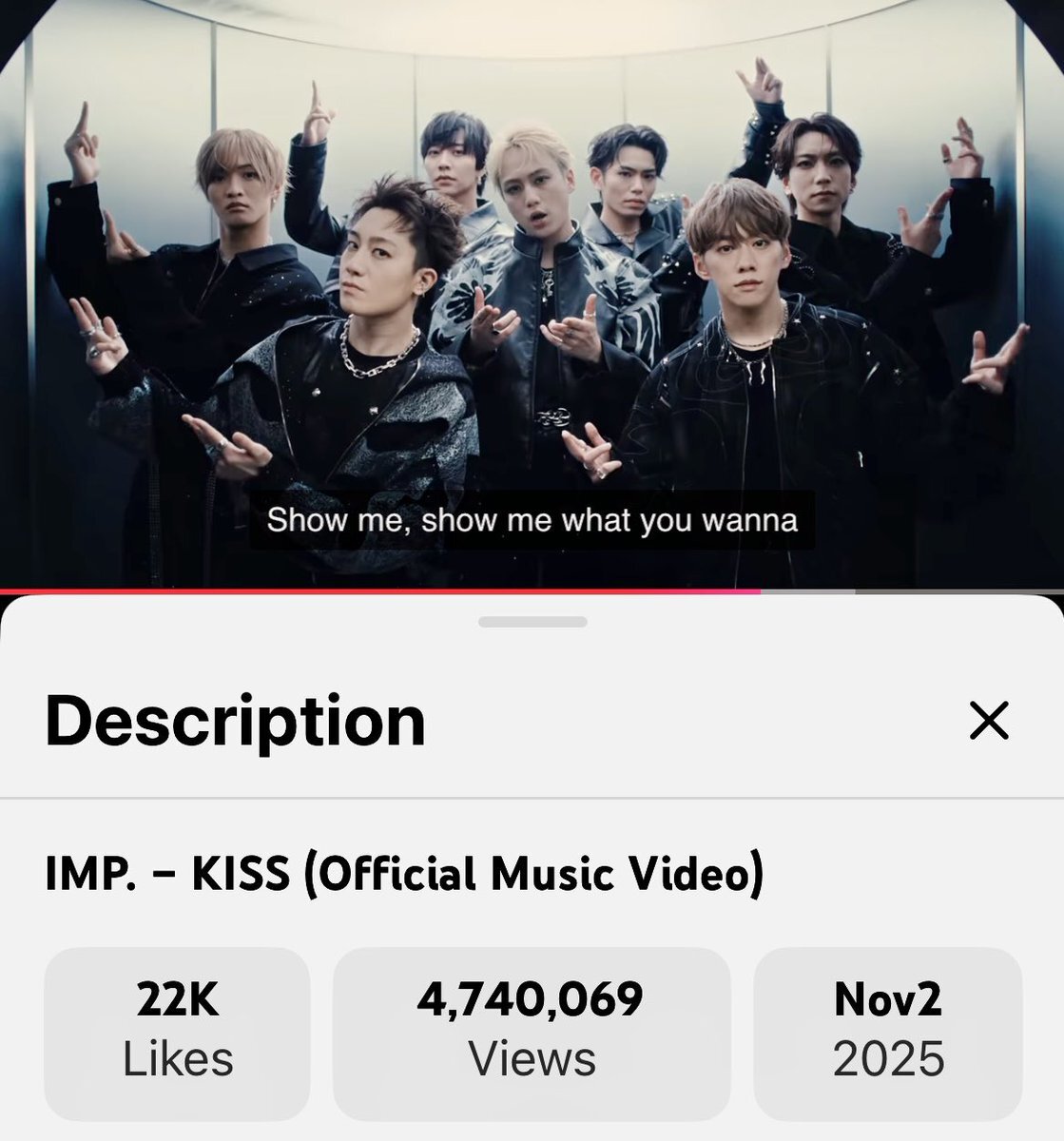 #KISS_IMP. MV4️⃣7️⃣4️⃣万回❣️FNSまで5️⃣0️⃣0️⃣行こうー❣️ ビルボ、MV再生数とかTVで取り上げられるもん。インパクトある数字を🎁してどんどん活躍の場を広げて欲しい🥹 #IMP. #MAGenter_IMP. #TOBE #横原悠毅 #基俊介 #ボイパ #影山拓也 #椿泰我 #鈴木大河 #佐藤新 #松井奏 youtu.be/HN_vk-at7vA?si… pic.x.com/RBGr0HX649